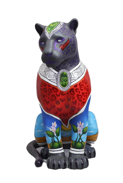 Nesta obra, a onça-pintada é representada como um ancestral sagrado, simbolizando a realeza de seu território amazônico. Este felino, o maior da América Latina, é fundamental para o equilíbrio do ecossistema e enfrenta ameaças de extinção devido a queimadas, caça ilegal, garimpos e desmatamento.