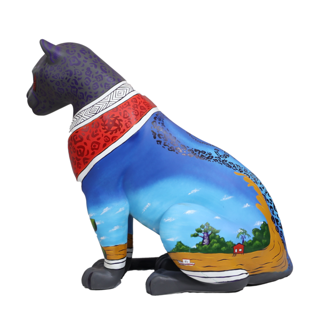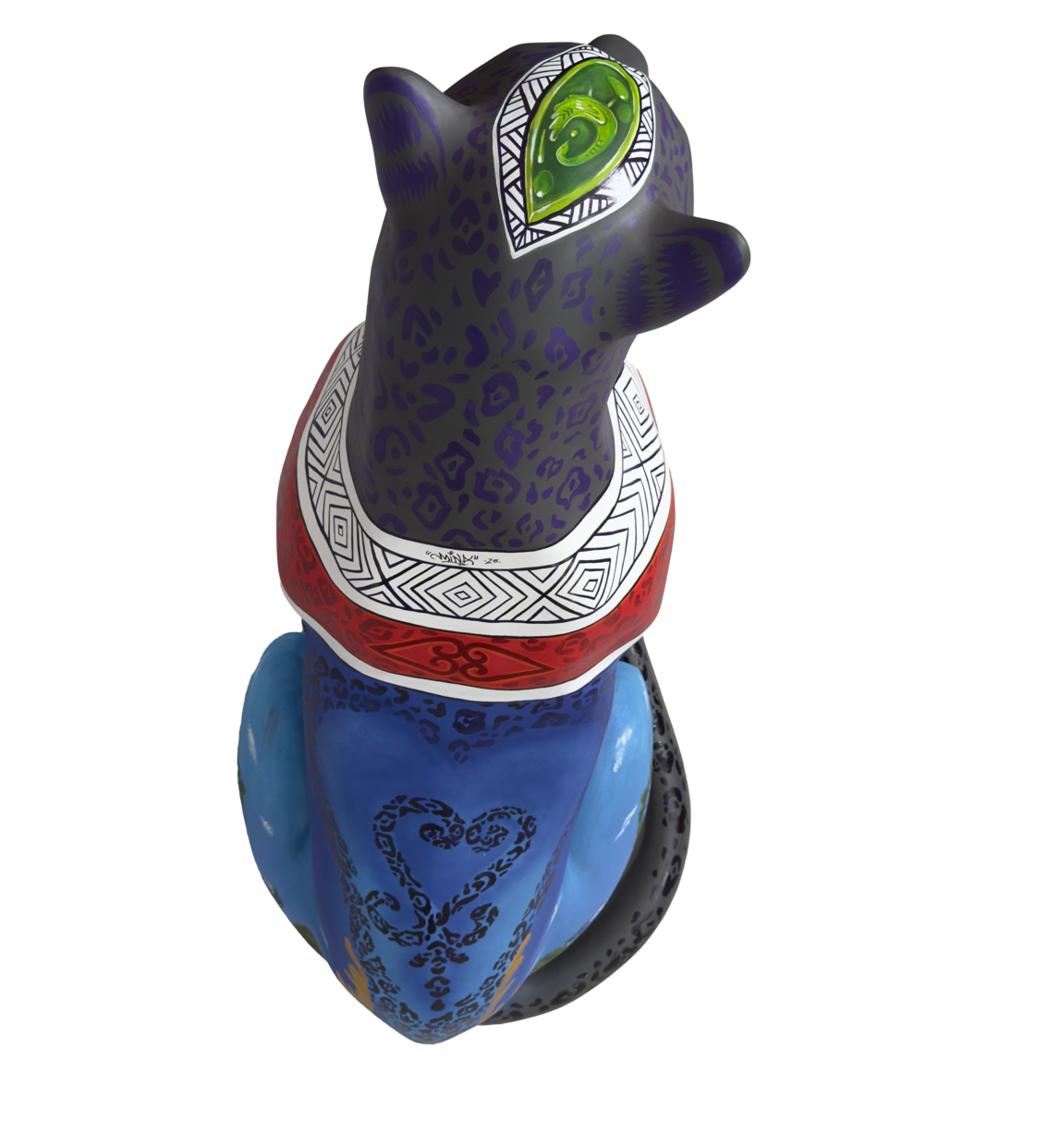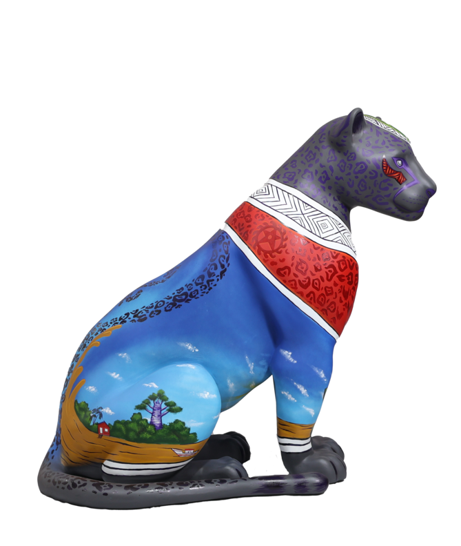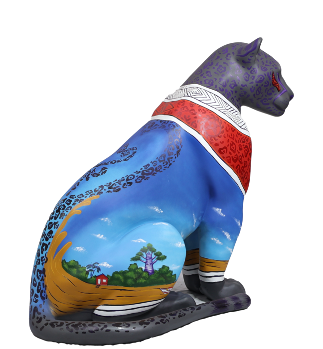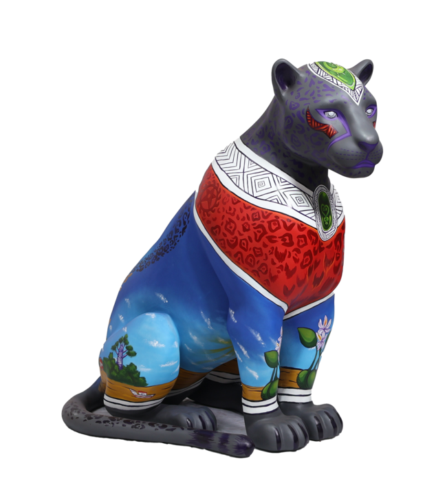 O manto vermelho que envolve a onça representa o alerta para os riscos que ela enfrenta, ao mesmo tempo em que simboliza a resistência das entidades que lutam pela preservação da vida desse animal. No centro do manto, uma joia verde representa a floresta e seus habitantes, servindo como um alerta contra as queimadas que destroem a biodiversidade. O Adinkra Sankofa, em forma de coração, nos lembra da importância de aprender com o passado para ressignificar o presente e construir um futuro sustentável.
