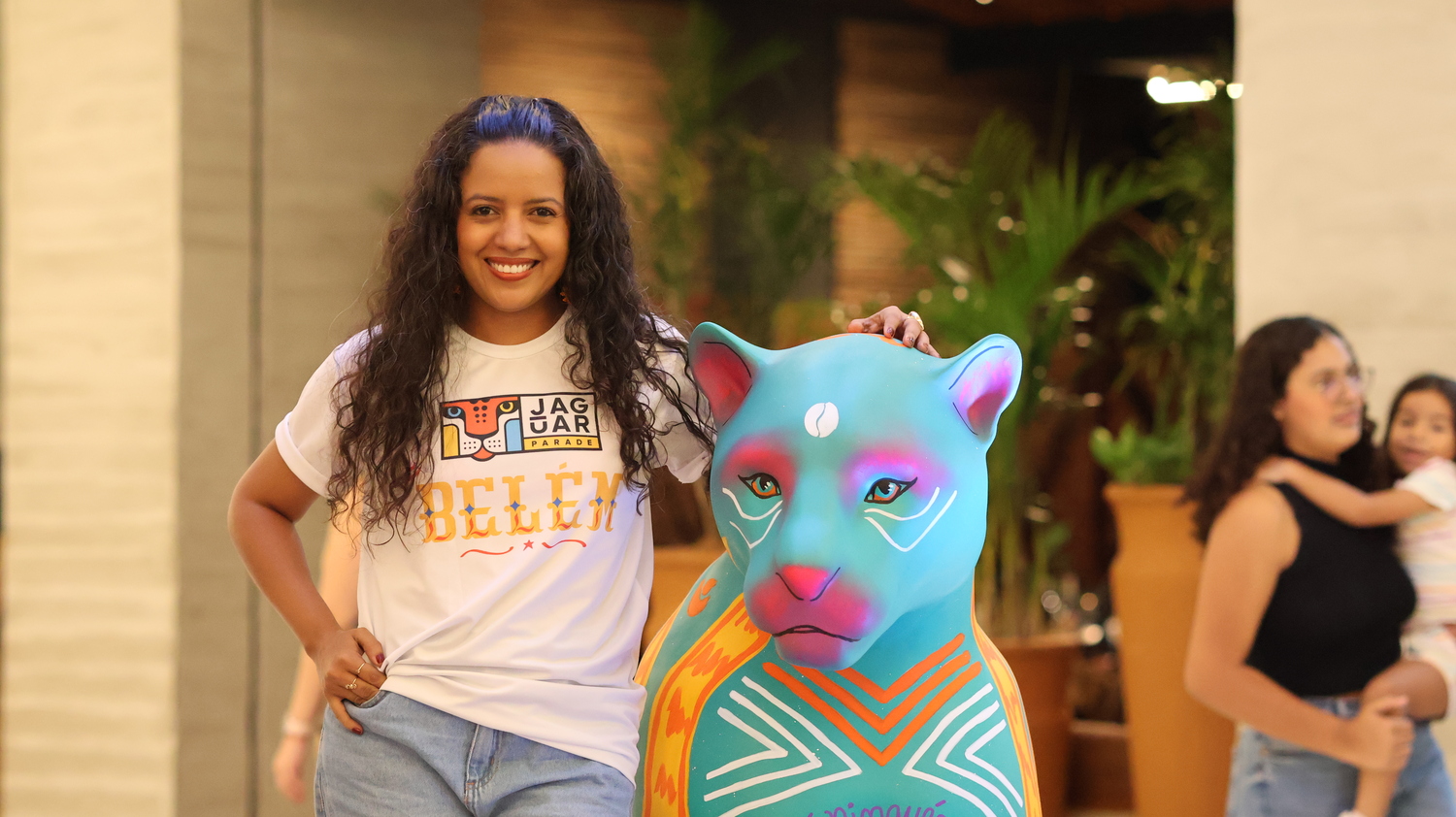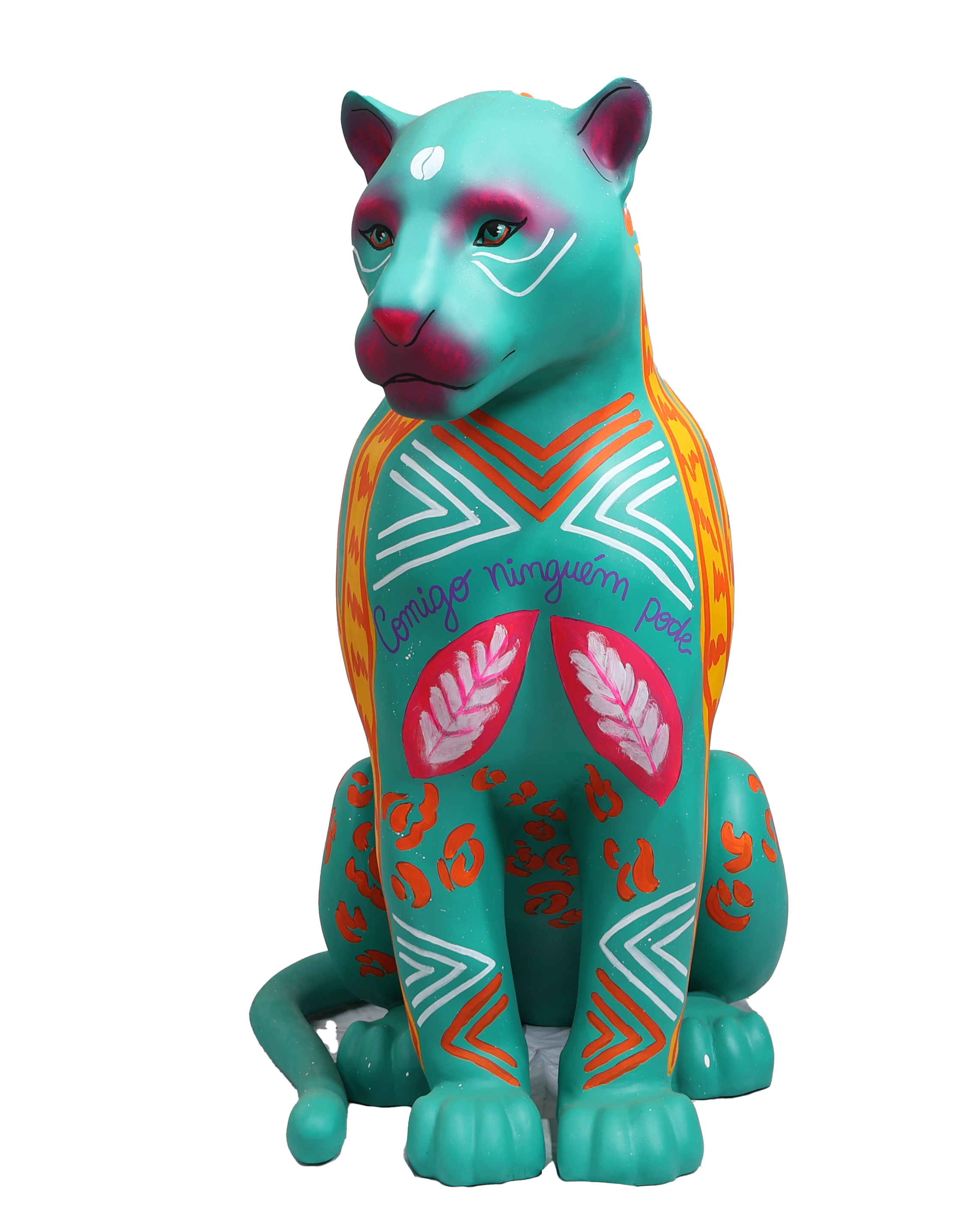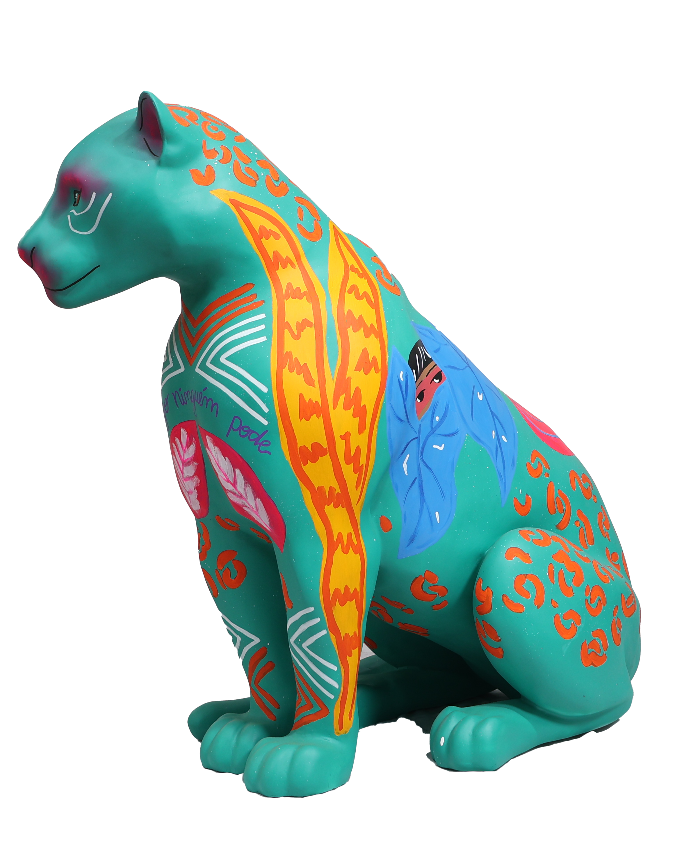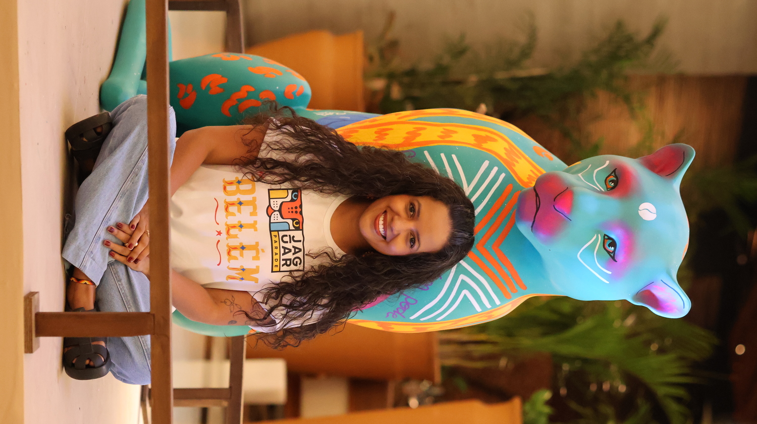 Minhas inspirações vieram de plantas atrativas muito comuns na região amazônica, conhecidas por sua energia de proteção. A Espada de São Jorge, a Comigo Ninguém Pode e o Tajá são exemplos dessas plantas, cada uma com o potencial de resguardar não apenas o lar, mas também as pessoas que nele habitam. Neste sentido, cito visualmente a personificação do tajá em uma entidade indígena para reforçar essa atmosfera da proteção, amuleto. Quis associar a figura do Jaguar a essa ideia de proteção vinda da flora, incorporando também grafismos indígenas e o símbolo adinkra Sankofa para enfatizar o papel fundamental dos povos originários e negros na preservação da fauna e da flora. Olhar para o passado, para a ancestralidade e o modo como eles se relacionavam com a natureza para rever o presente e construir um futuro.