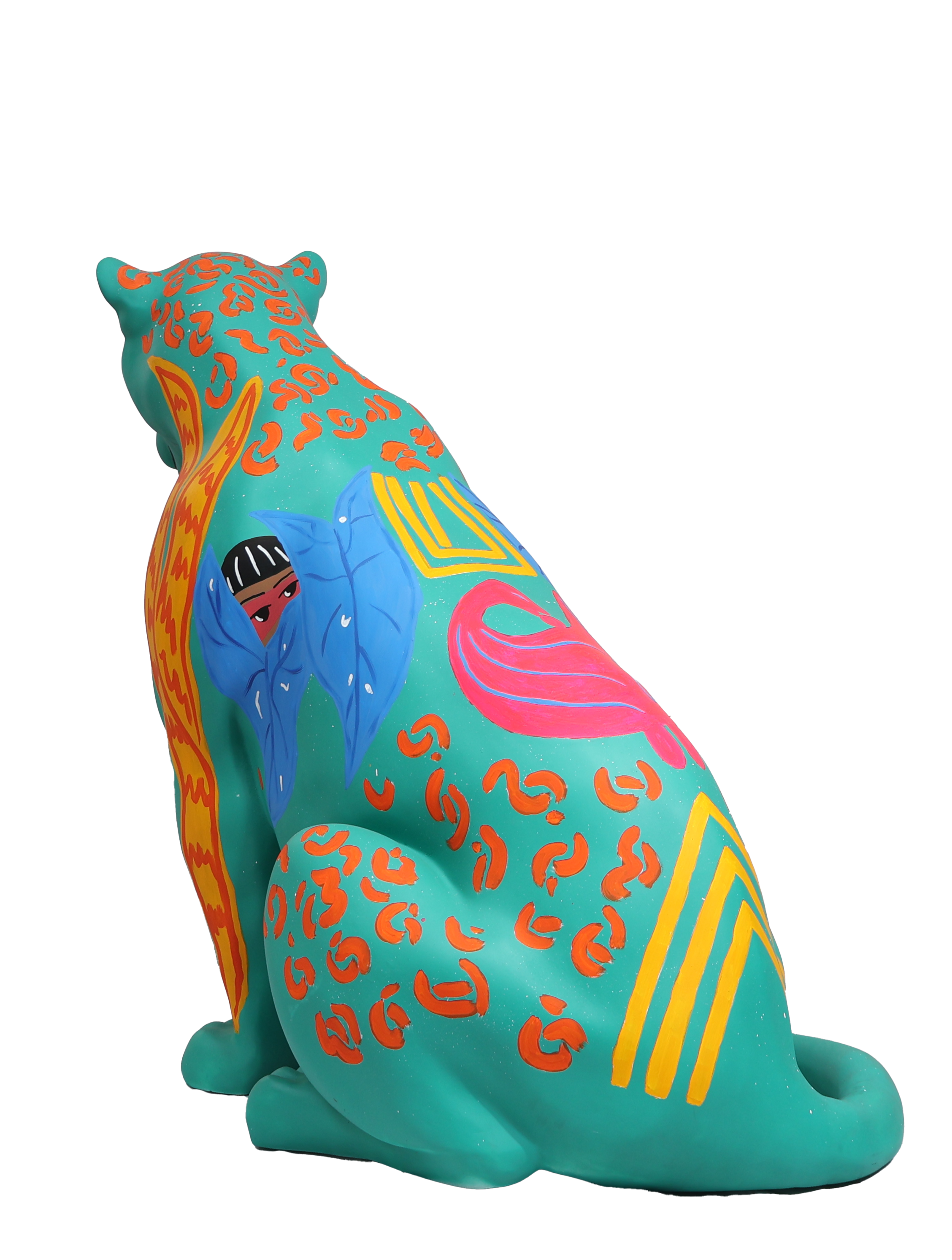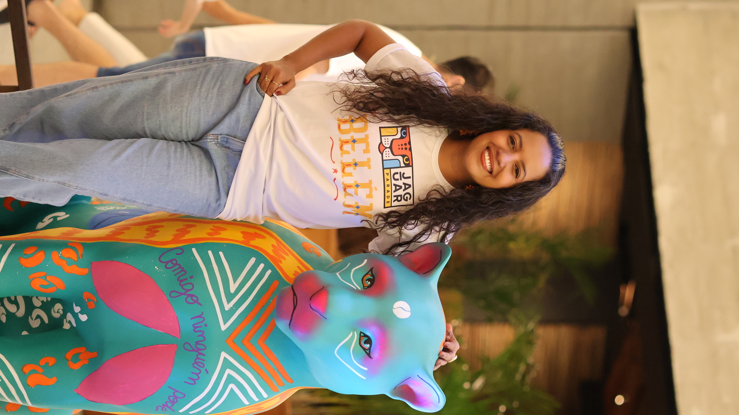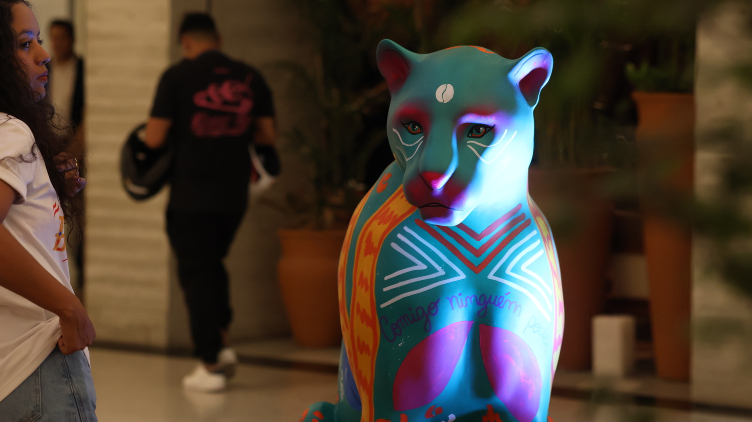 Minhas inspirações vieram de plantas atrativas muito comuns na região amazônica, conhecidas por sua energia de proteção. A Espada de São Jorge, a Comigo Ninguém Pode e o Tajá são exemplos dessas plantas, cada uma com o potencial de resguardar não apenas o lar, mas também as pessoas que nele habitam. Neste sentido, cito visualmente a personificação do tajá em uma entidade indígena para reforçar essa atmosfera da proteção, amuleto. Quis associar a figura do Jaguar a essa ideia de proteção vinda da flora, incorporando também grafismos indígenas e o símbolo adinkra Sankofa para enfatizar o papel fundamental dos povos originários e negros na preservação da fauna e da flora. Olhar para o passado, para a ancestralidade e o modo como eles se relacionavam com a natureza para rever o presente e construir um futuro.