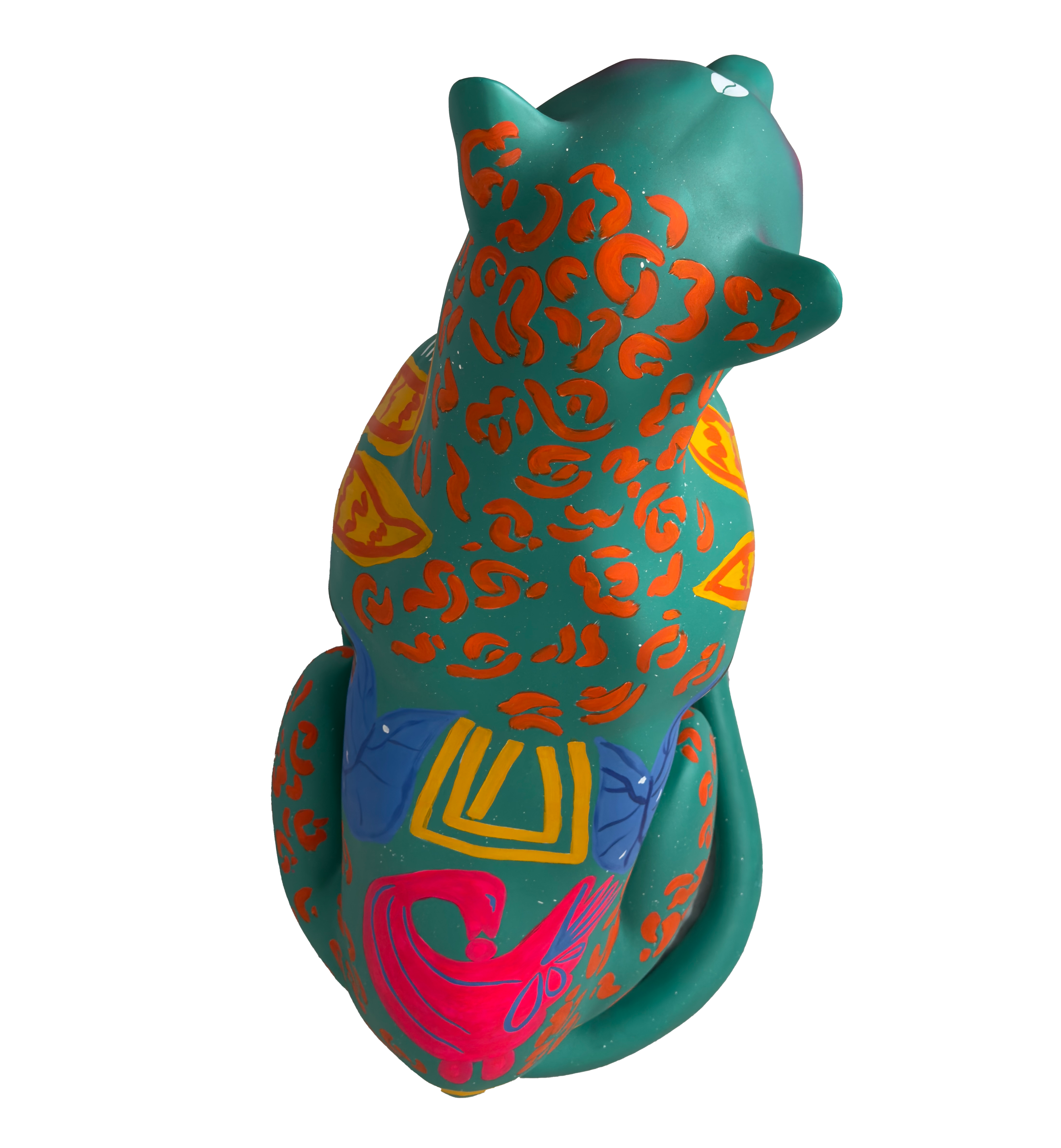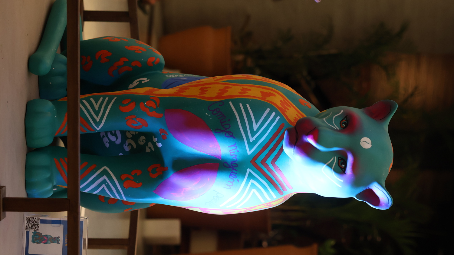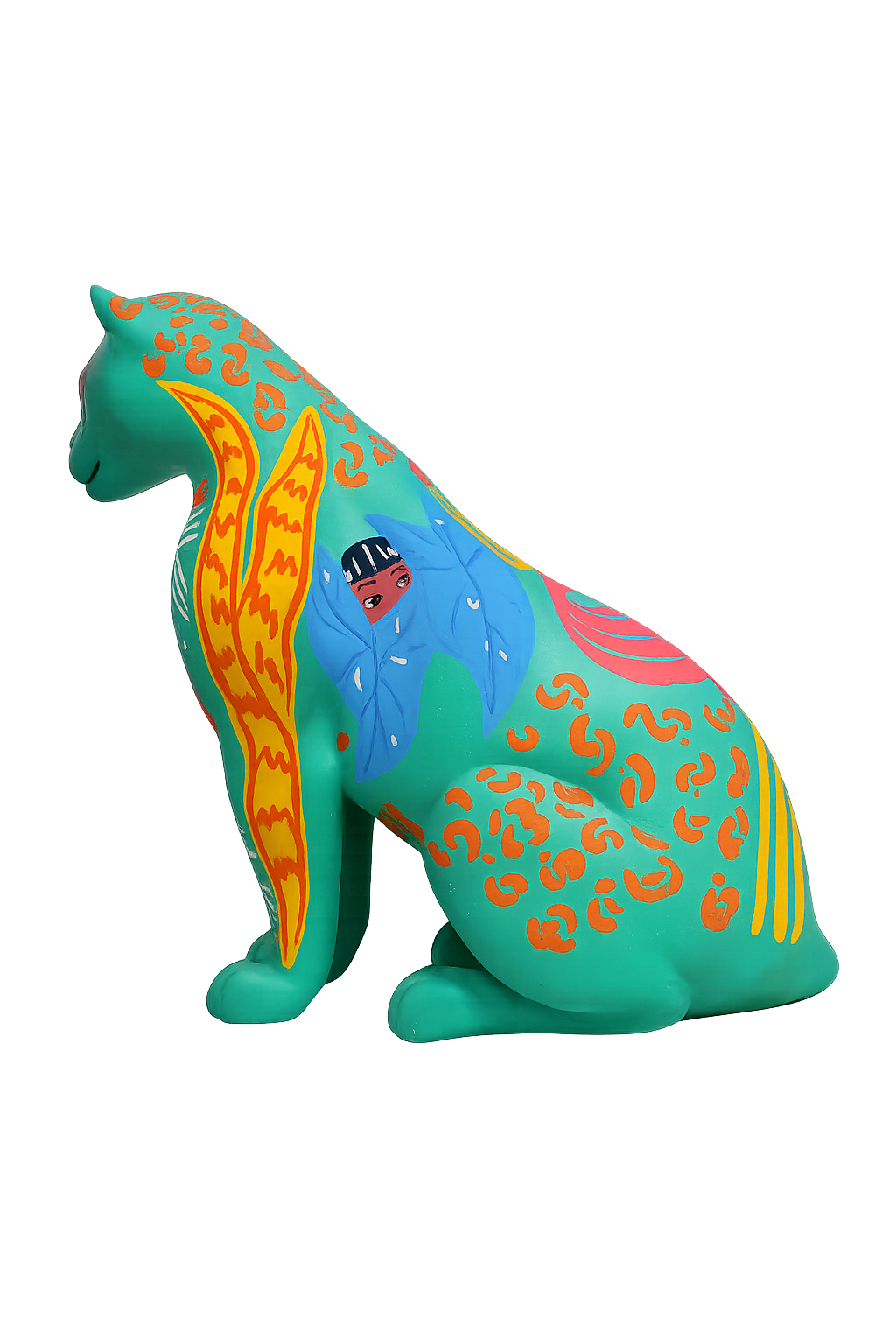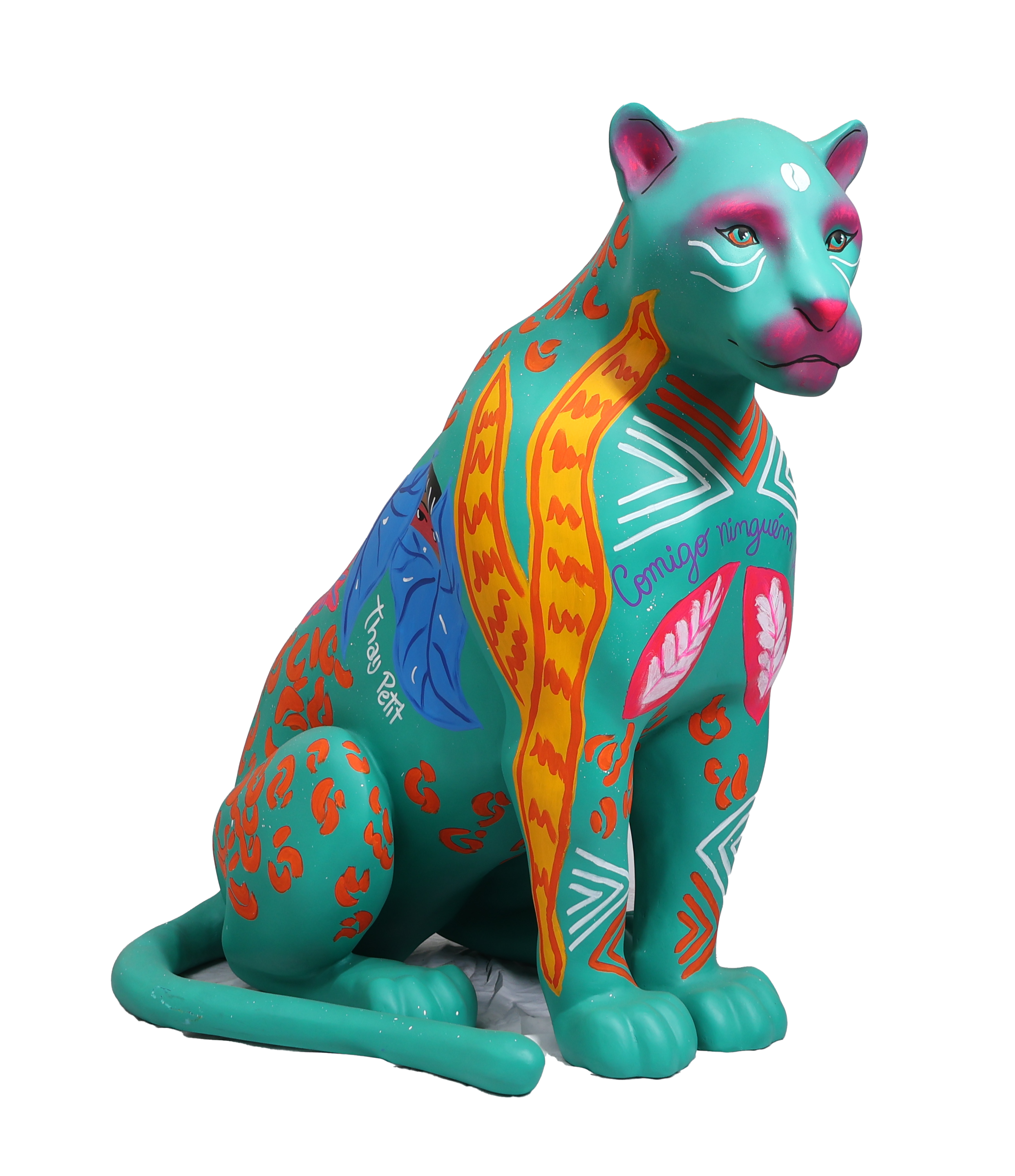 Minhas inspirações vieram de plantas atrativas muito comuns na região amazônica, conhecidas por sua energia de proteção. A Espada de São Jorge, a Comigo Ninguém Pode e o Tajá são exemplos dessas plantas, cada uma com o potencial de resguardar não apenas o lar, mas também as pessoas que nele habitam. Neste sentido, cito visualmente a personificação do tajá em uma entidade indígena para reforçar essa atmosfera da proteção, amuleto. Quis associar a figura do Jaguar a essa ideia de proteção vinda da flora, incorporando também grafismos indígenas e o símbolo adinkra Sankofa para enfatizar o papel fundamental dos povos originários e negros na preservação da fauna e da flora. Olhar para o passado, para a ancestralidade e o modo como eles se relacionavam com a natureza para rever o presente e construir um futuro.