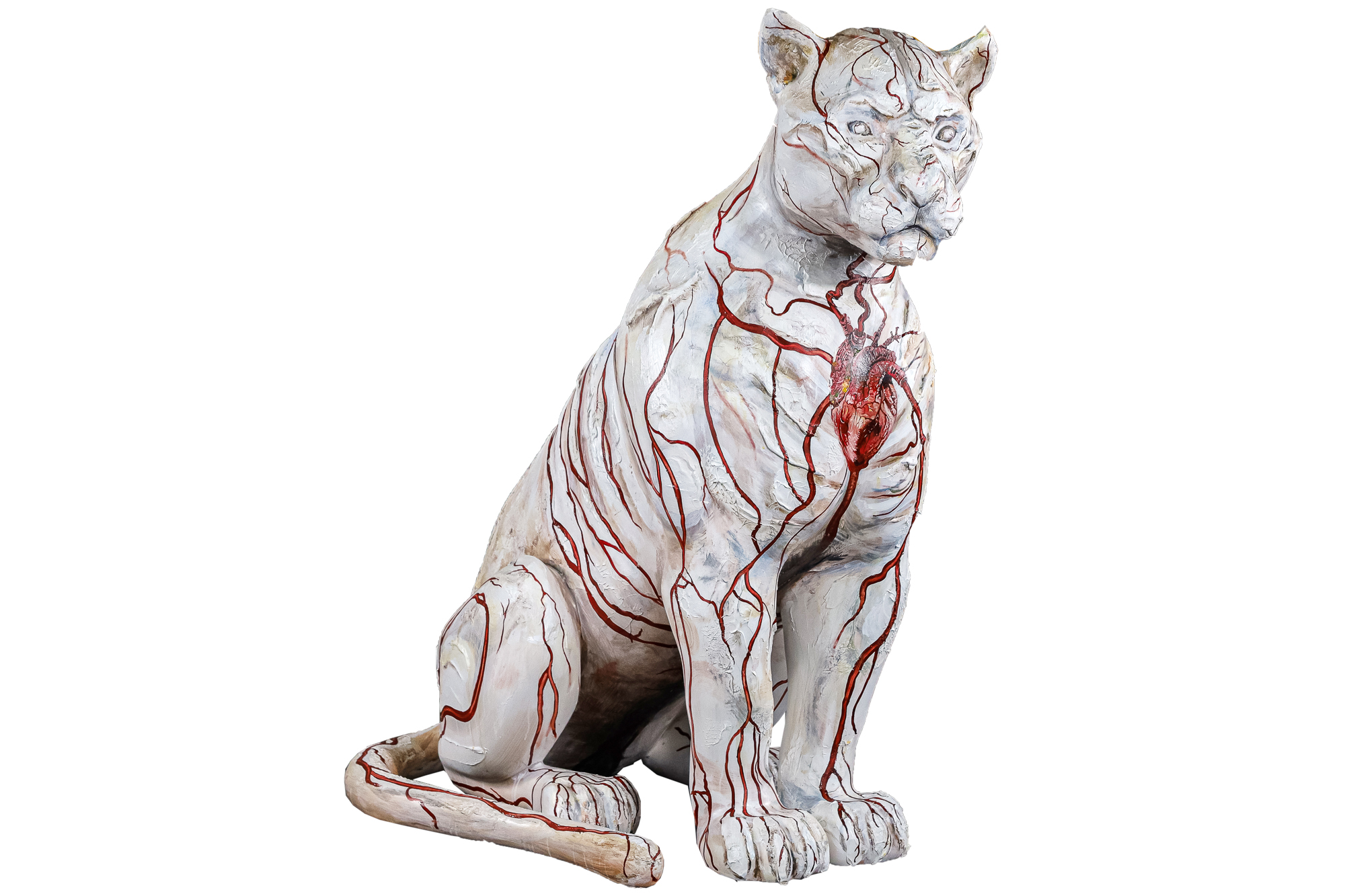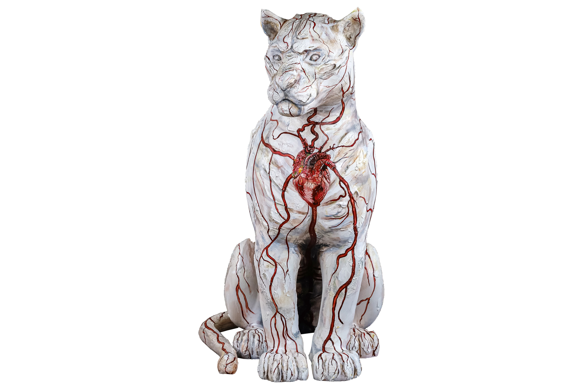 The main purpose of the intervention is to enhance the anatomical elements of the jaguar by reinforcing the contours of muscles and bones and inserting veins and arteries that come out of a realistic heart painted on the animal's chest. The heart inserted in the jaguar's chest is a human heart, represented here to propose an association between human life and wildlife.