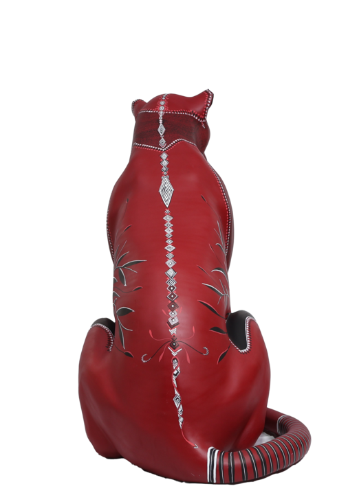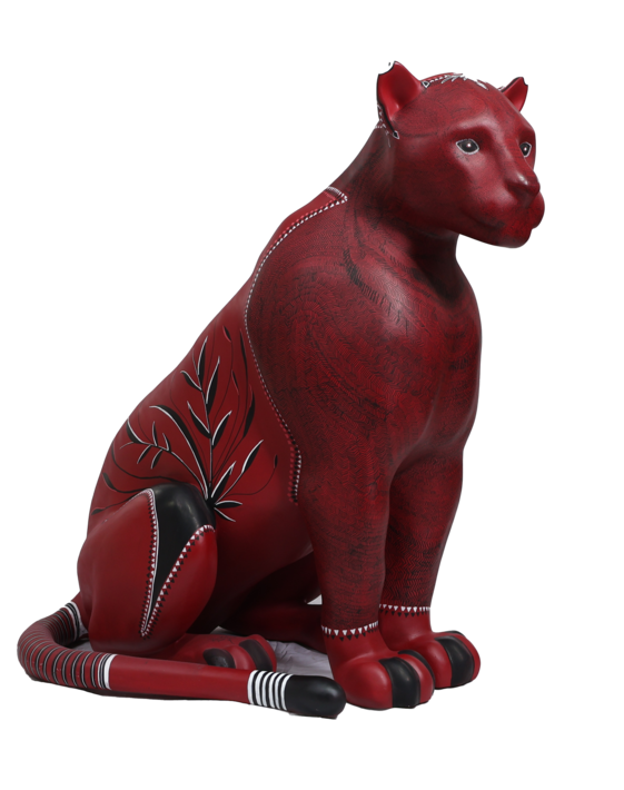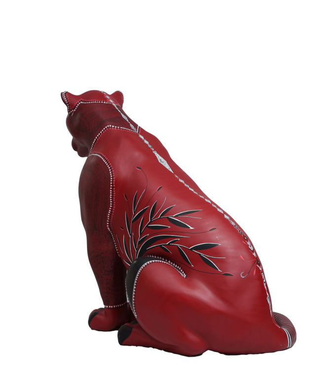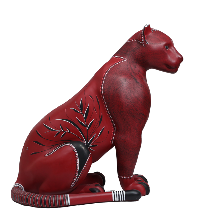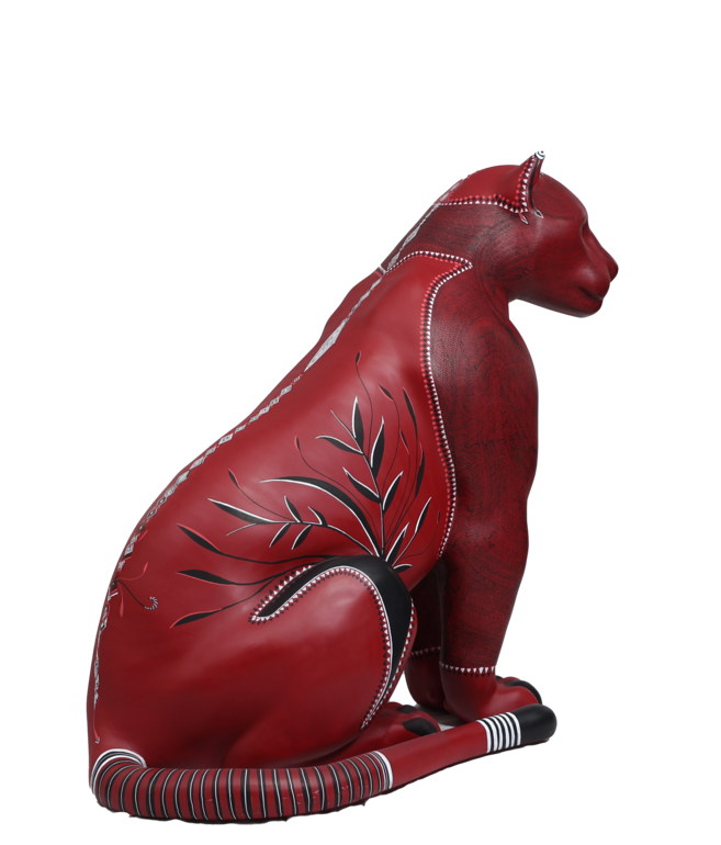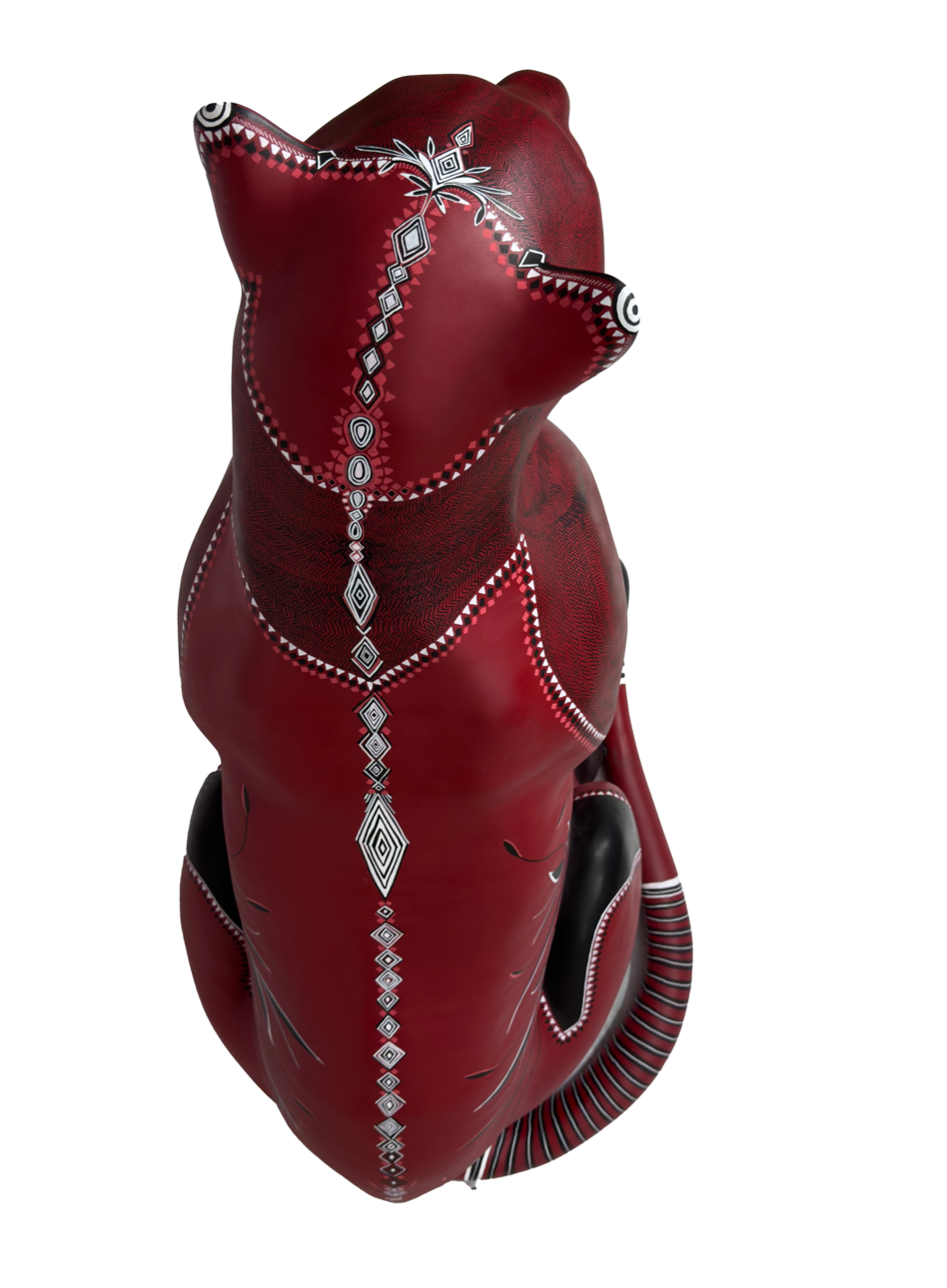 A superfície vermelha vibra como lava ou seiva, enquanto os grafismos desenhados com canetas Posca se transformam em cartografia viva. Cada linha é gesto, cada repetição é memória. O corpo do jaguar é, ao mesmo tempo, planta, rocha e animal. Uma travessia.