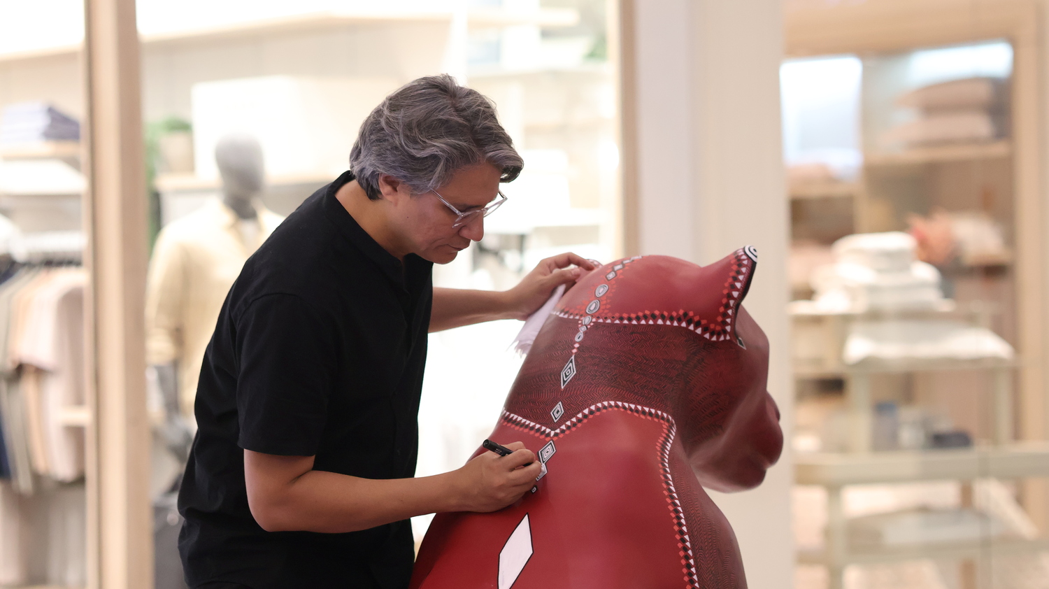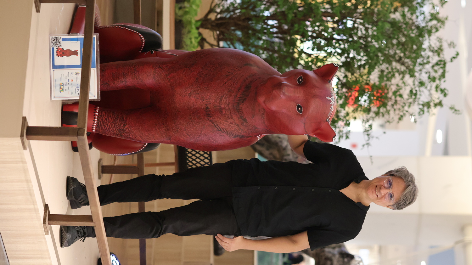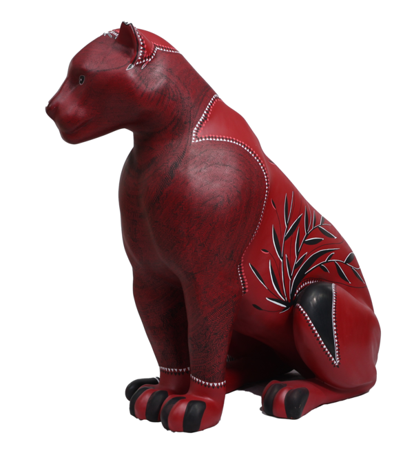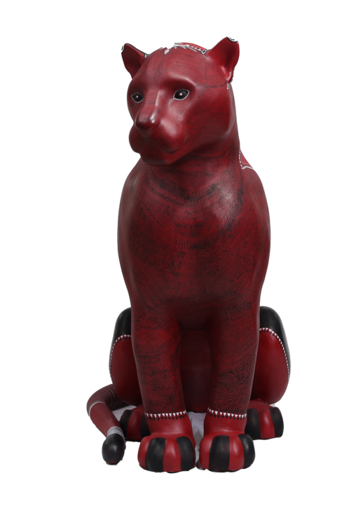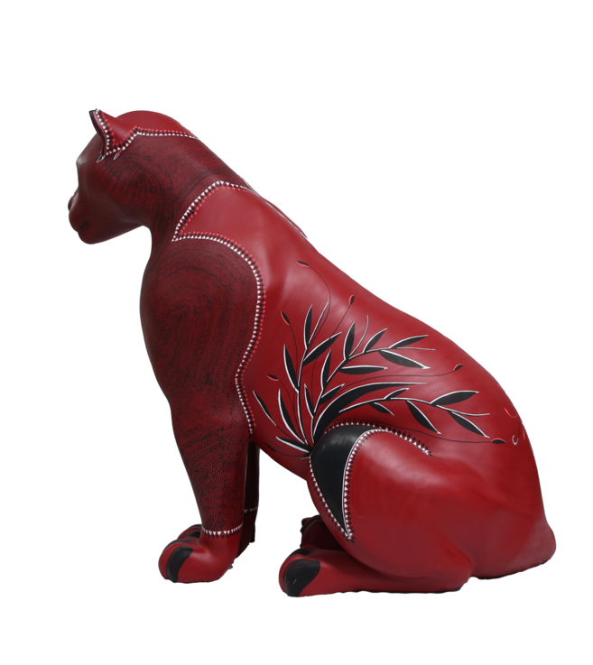 A superfície vermelha vibra como lava ou seiva, enquanto os grafismos desenhados com canetas Posca se transformam em cartografia viva. Cada linha é gesto, cada repetição é memória. O corpo do jaguar é, ao mesmo tempo, planta, rocha e animal. Uma travessia.