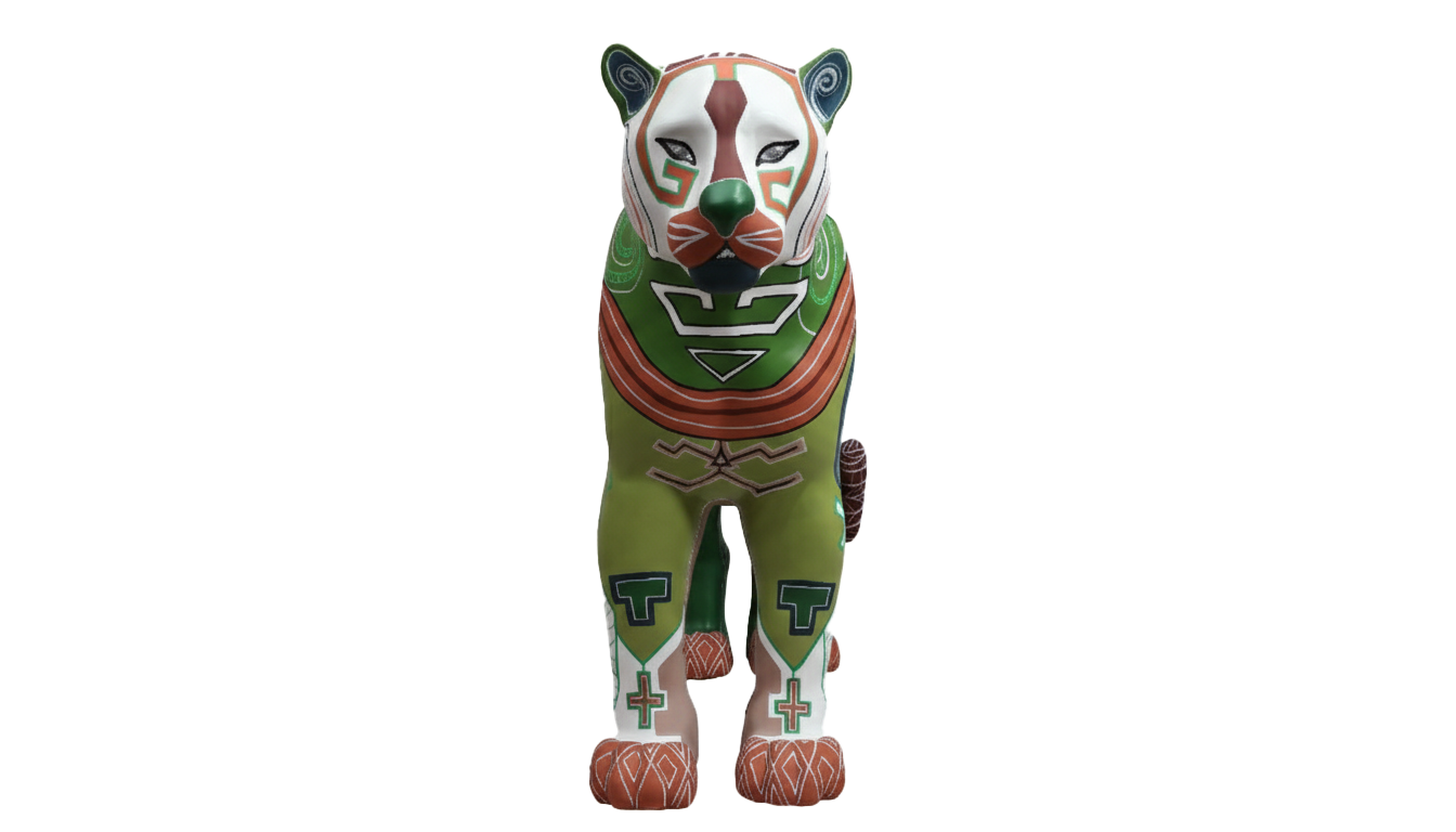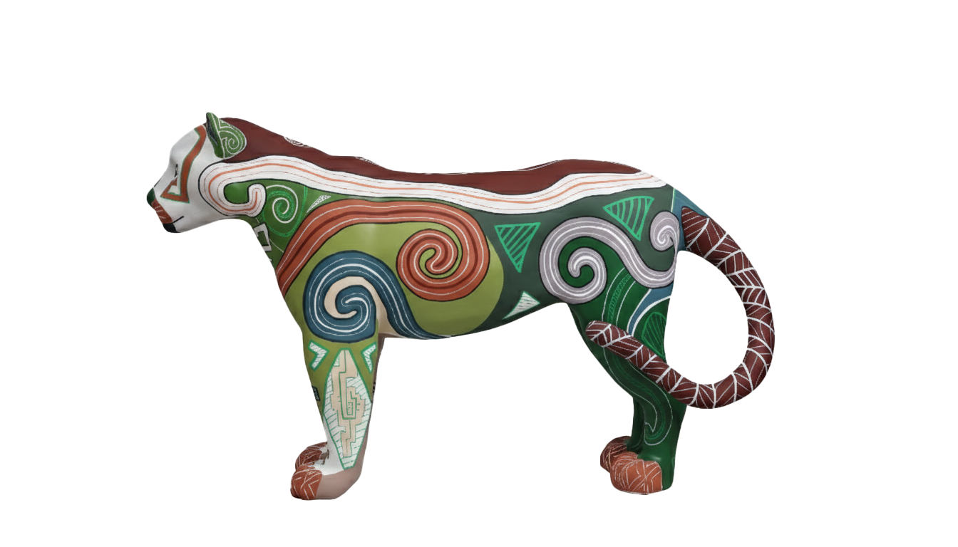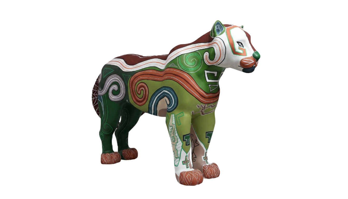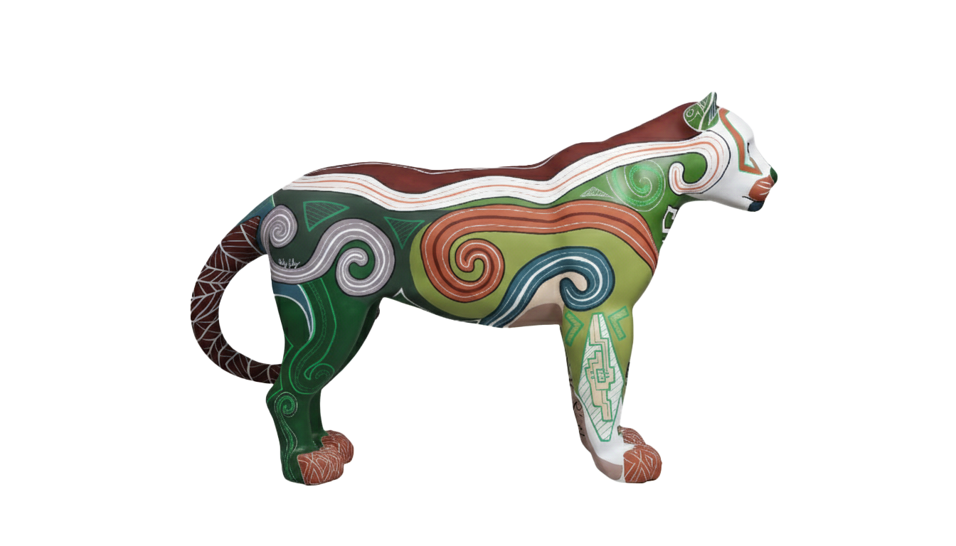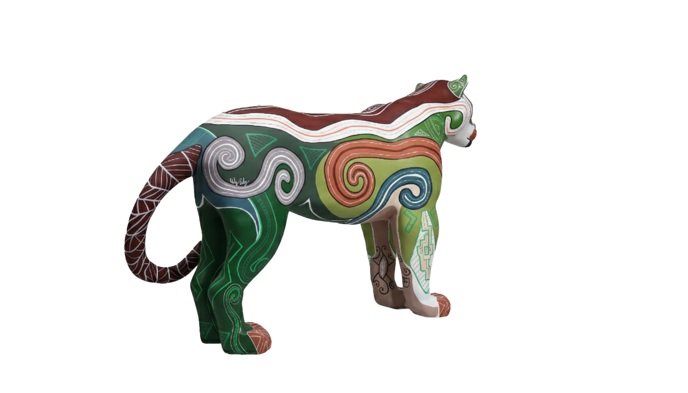 Esta obra nasce da fusão entre o caboclofuturismo e os grafismos ancestrais marajoaras, ressignificados através da linguagem urbana. A onça, símbolo de força, espiritualidade e resistência amazônica, é transformada em uma entidade guardiã do tempo e do território, revestida com espirais, traços e cores que remetem às cerâmicas do Marajó e à cosmovisão indígena-cabocla. Ela carrega consigo o passado mitológico, o presente de luta e o futuro imaginado por artistas que sonham mundos de cura, memória e encantaria. Onde cada cor tem seu significado, conectando as cores ao universo simbólico da obra: