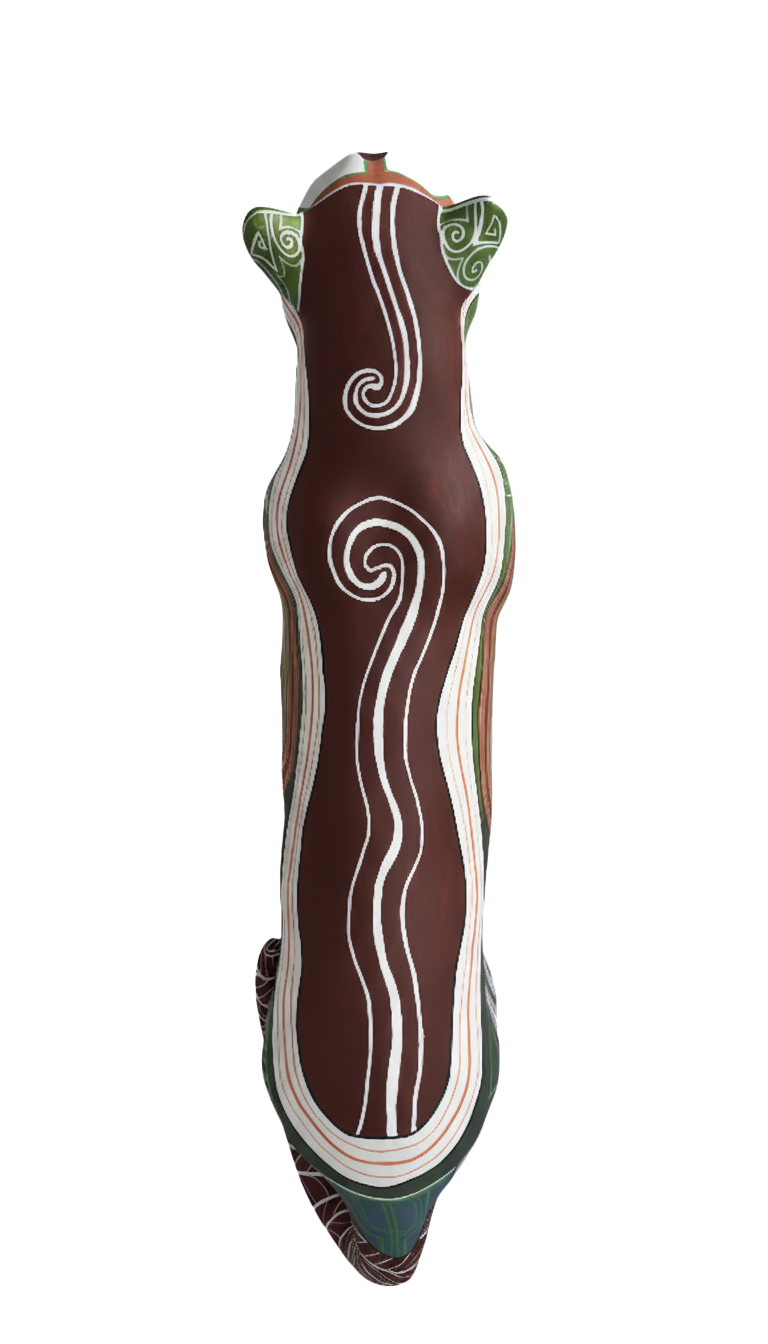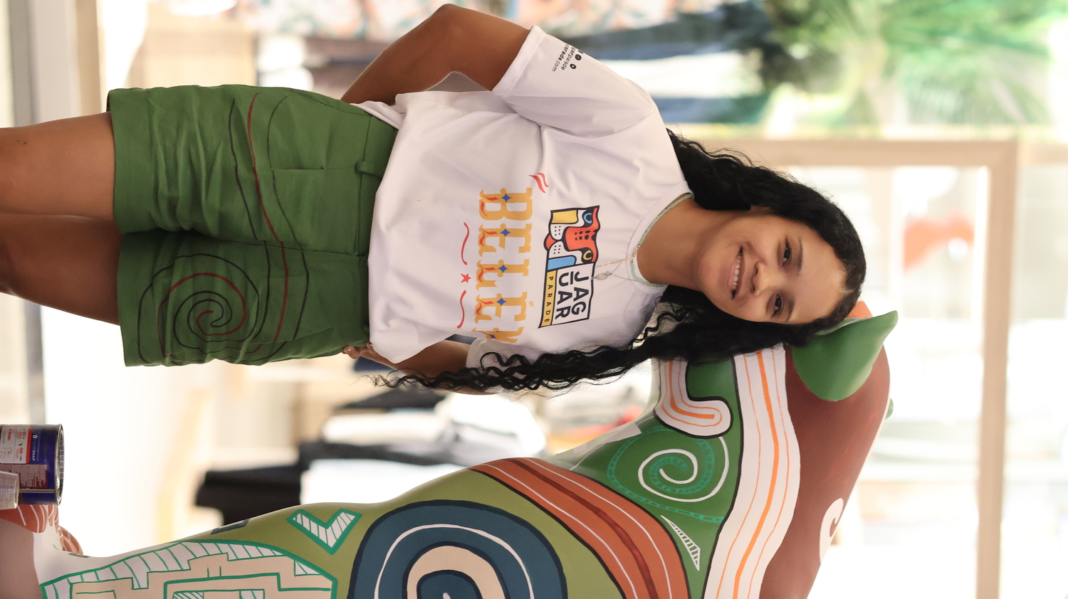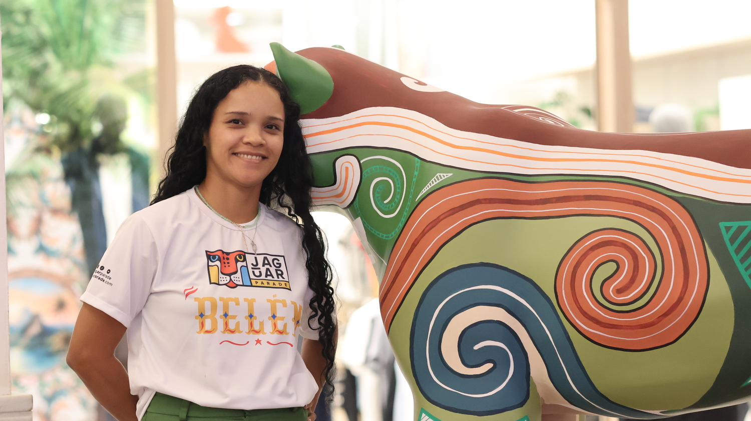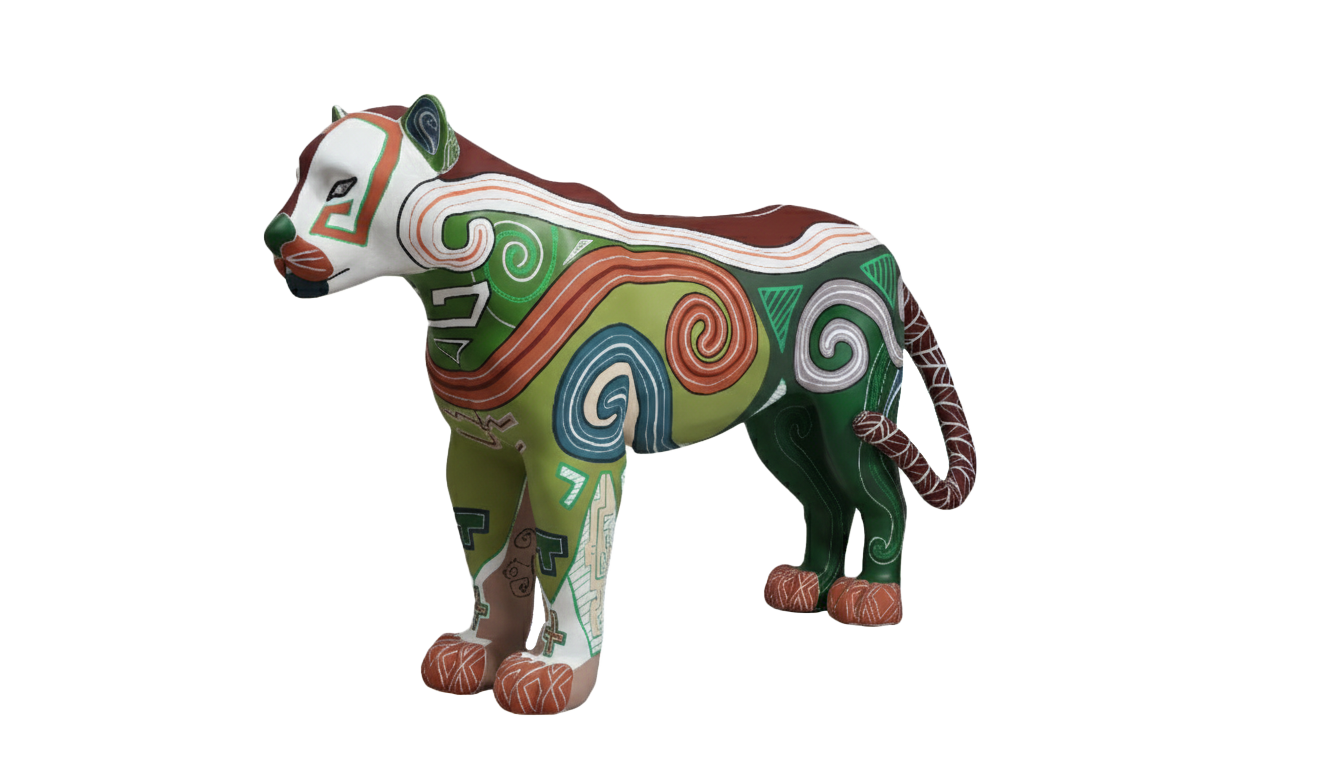 Esta obra nasce da fusão entre o caboclofuturismo e os grafismos ancestrais marajoaras, ressignificados através da linguagem urbana. A onça, símbolo de força, espiritualidade e resistência amazônica, é transformada em uma entidade guardiã do tempo e do território, revestida com espirais, traços e cores que remetem às cerâmicas do Marajó e à cosmovisão indígena-cabocla. Ela carrega consigo o passado mitológico, o presente de luta e o futuro imaginado por artistas que sonham mundos de cura, memória e encantaria. Onde cada cor tem seu significado, conectando as cores ao universo simbólico da obra: