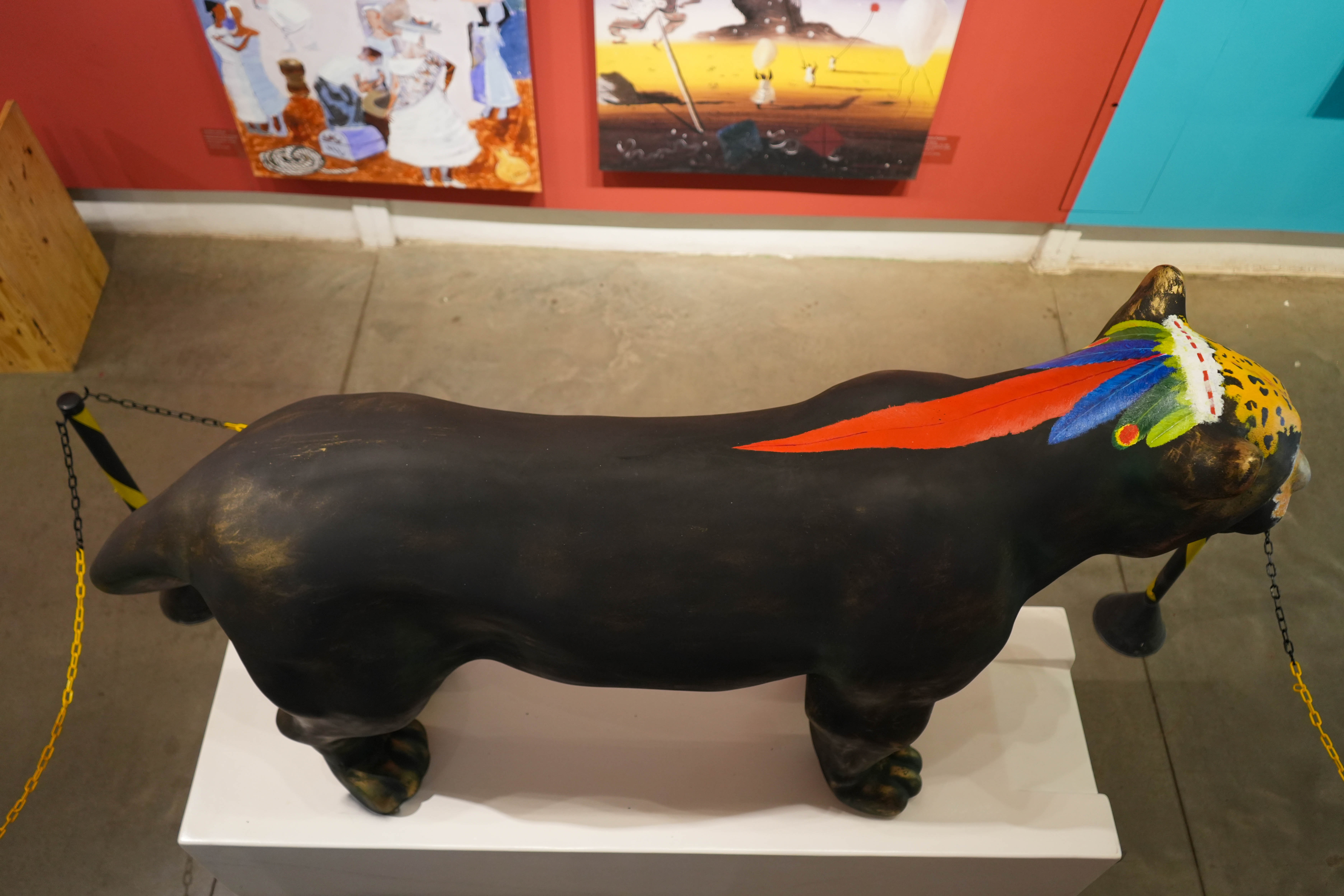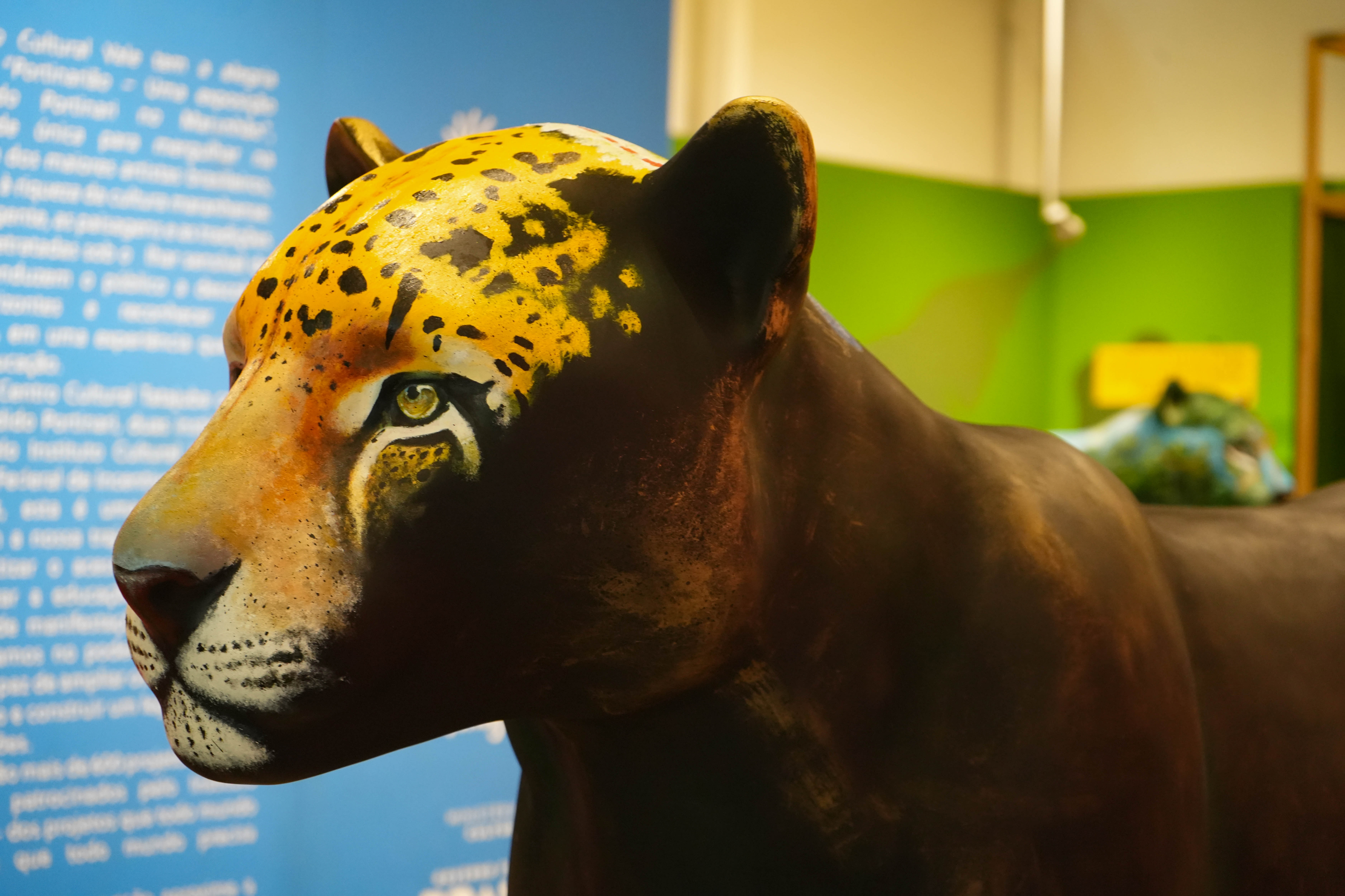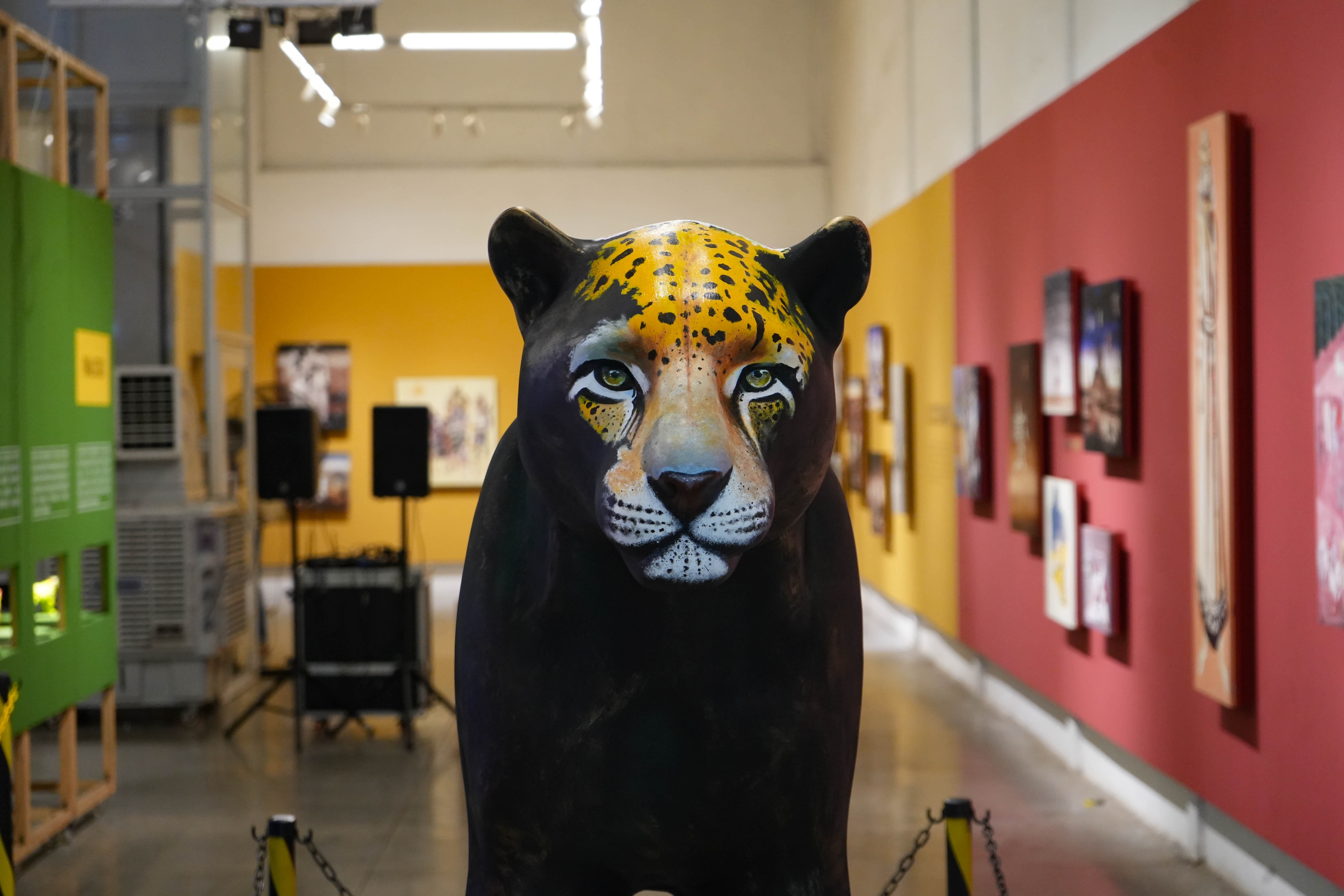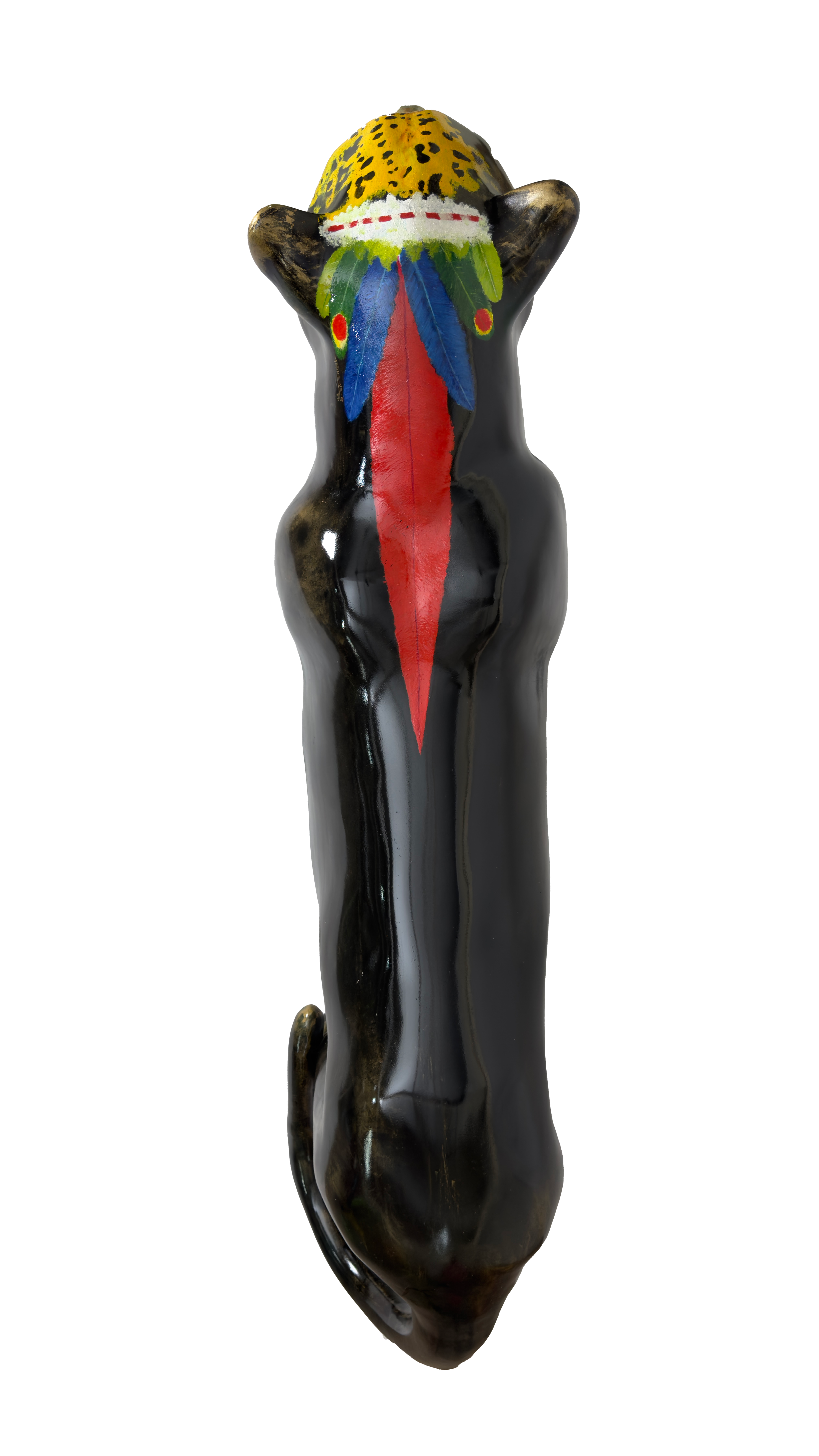O corpo negro da onça, com manchas douradas e verdes, representam uma escultura feita de um metal nobre e resistente, já lembrando uma espécie desaparecida, que existe apenas na homenagem, em uma linda obra de arte. A onça pintada traz em seus lombos um cocar indígena, em referência aos povos originários, fazendo parte do seu mundo existencial, onde é sagrada, celebrada em rituais e conhecida como: ZAUARO HU.