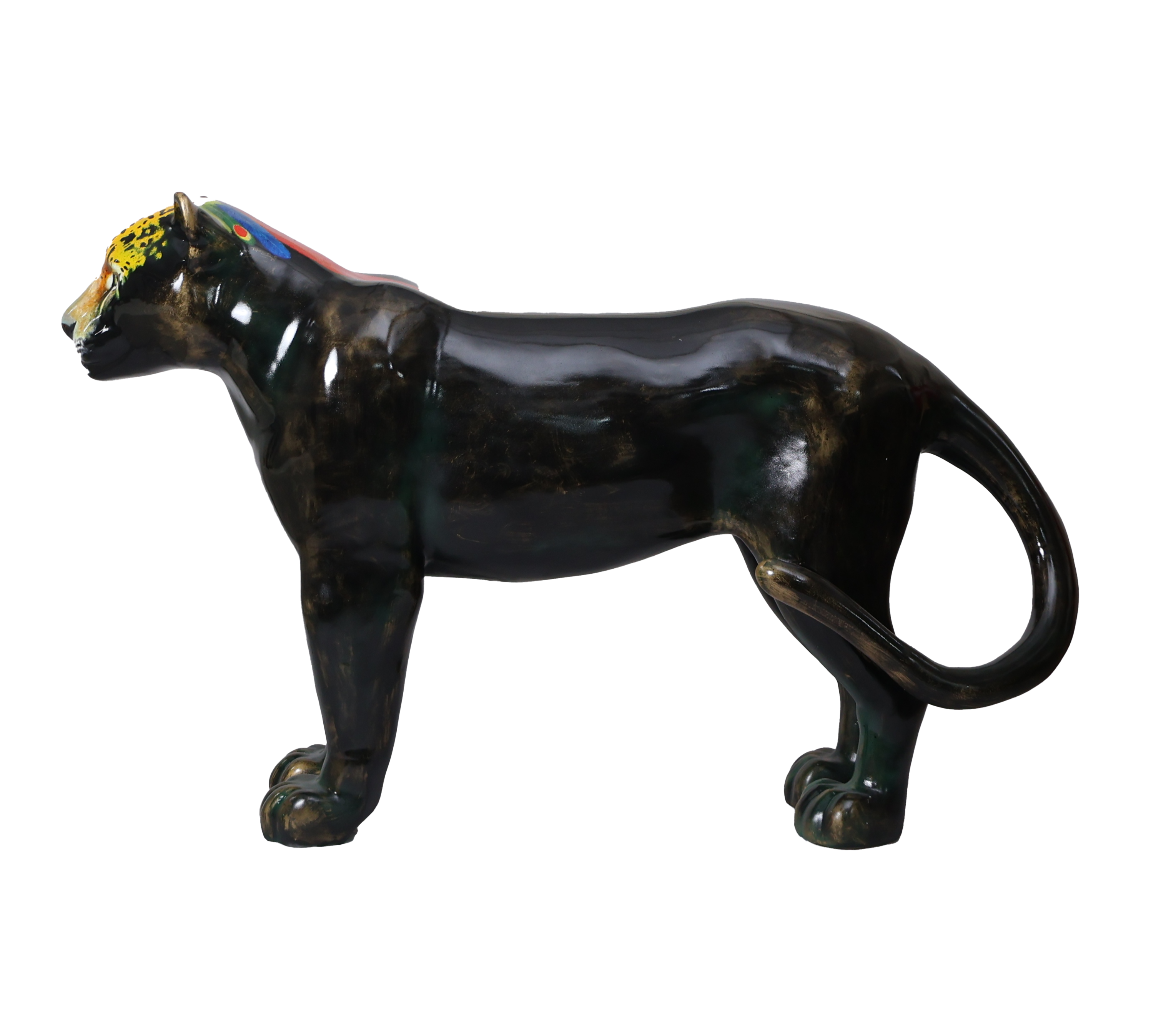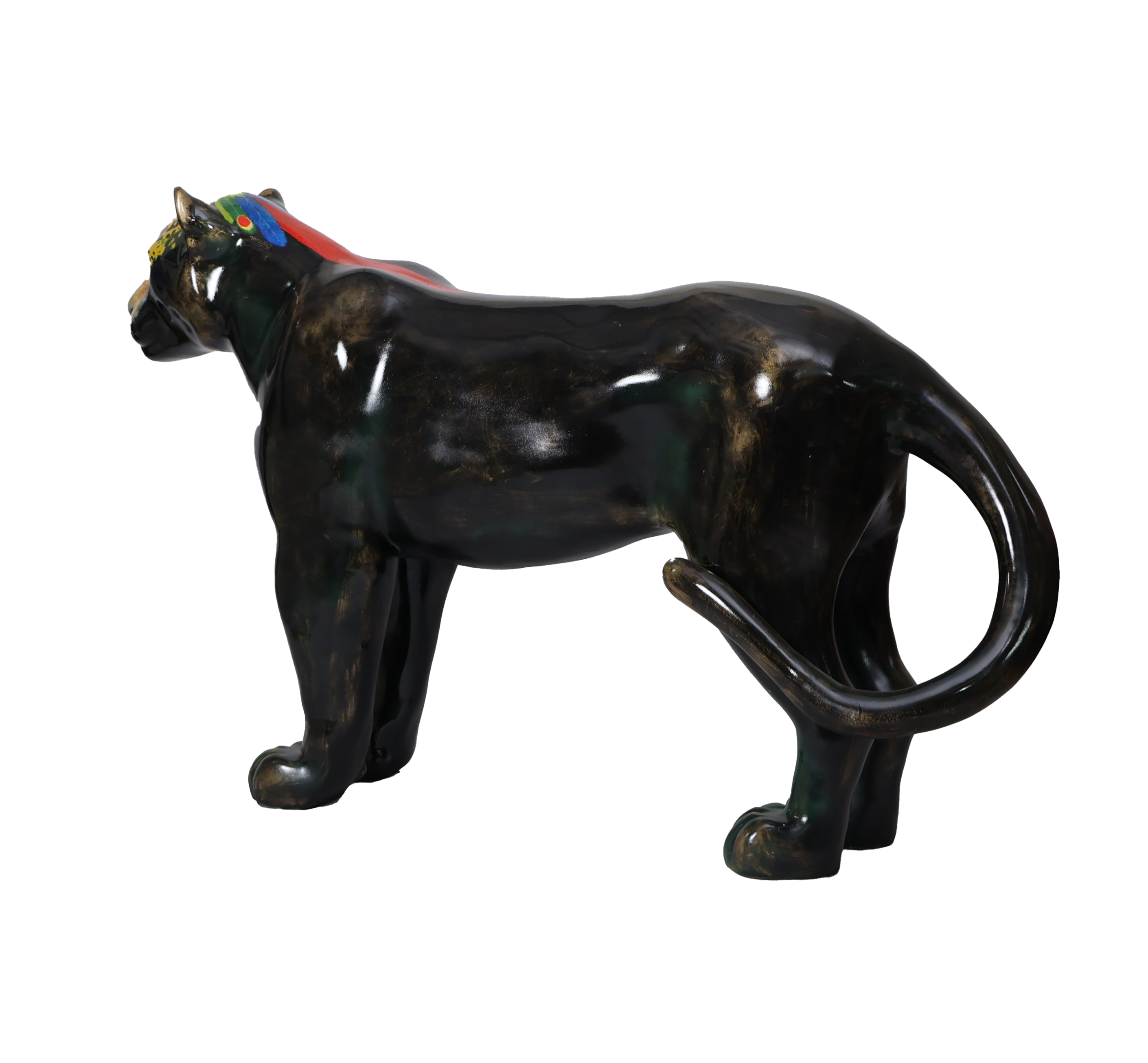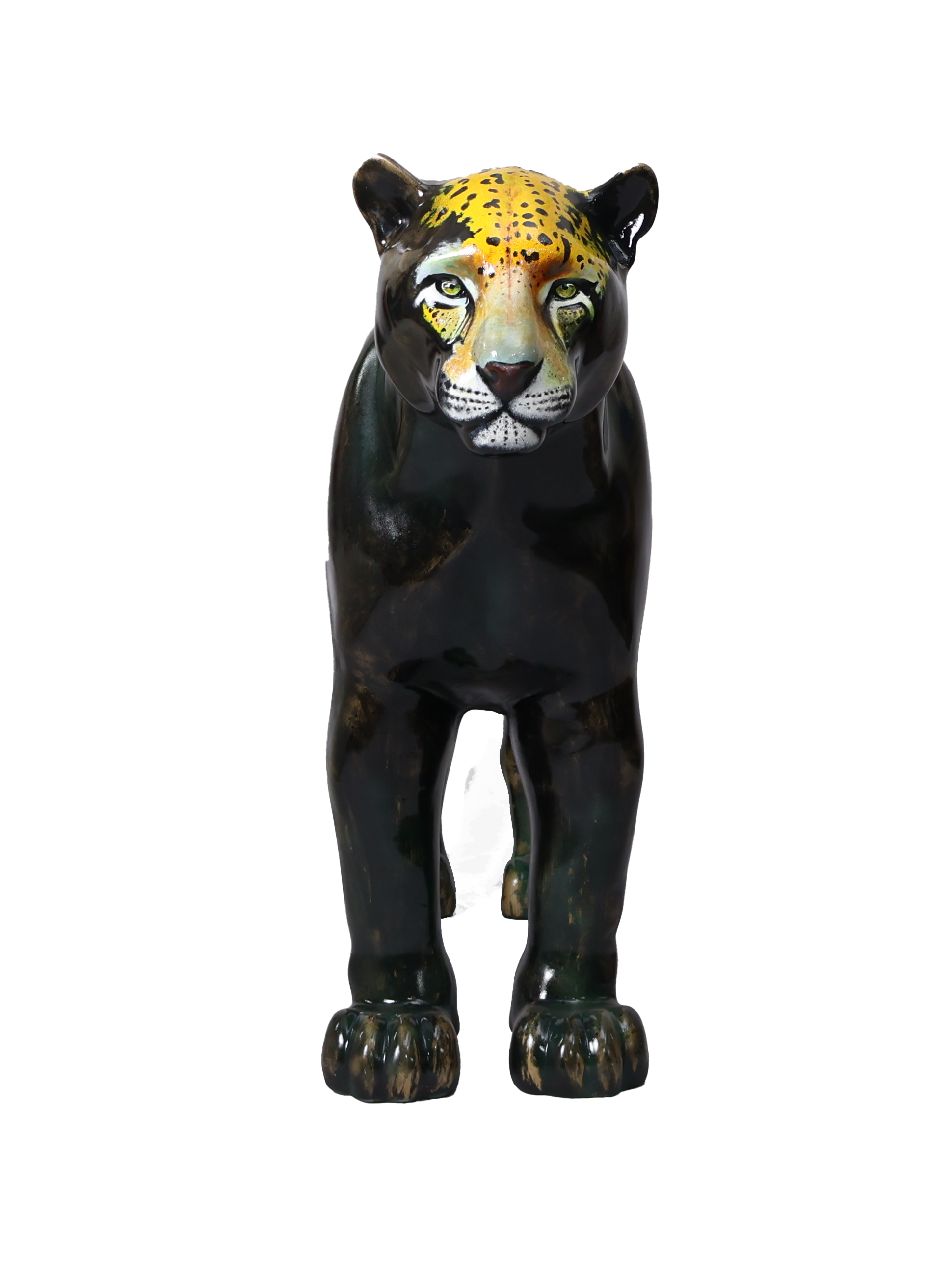 O corpo negro da onça, com manchas douradas e verdes, representam uma escultura feita de um metal nobre e resistente, já lembrando uma espécie desaparecida, que existe apenas na homenagem, em uma linda obra de arte. A onça pintada traz em seus lombos um cocar indígena, em referência aos povos originários, fazendo parte do seu mundo existencial, onde é sagrada, celebrada em rituais e conhecida como: ZAUARO HU.