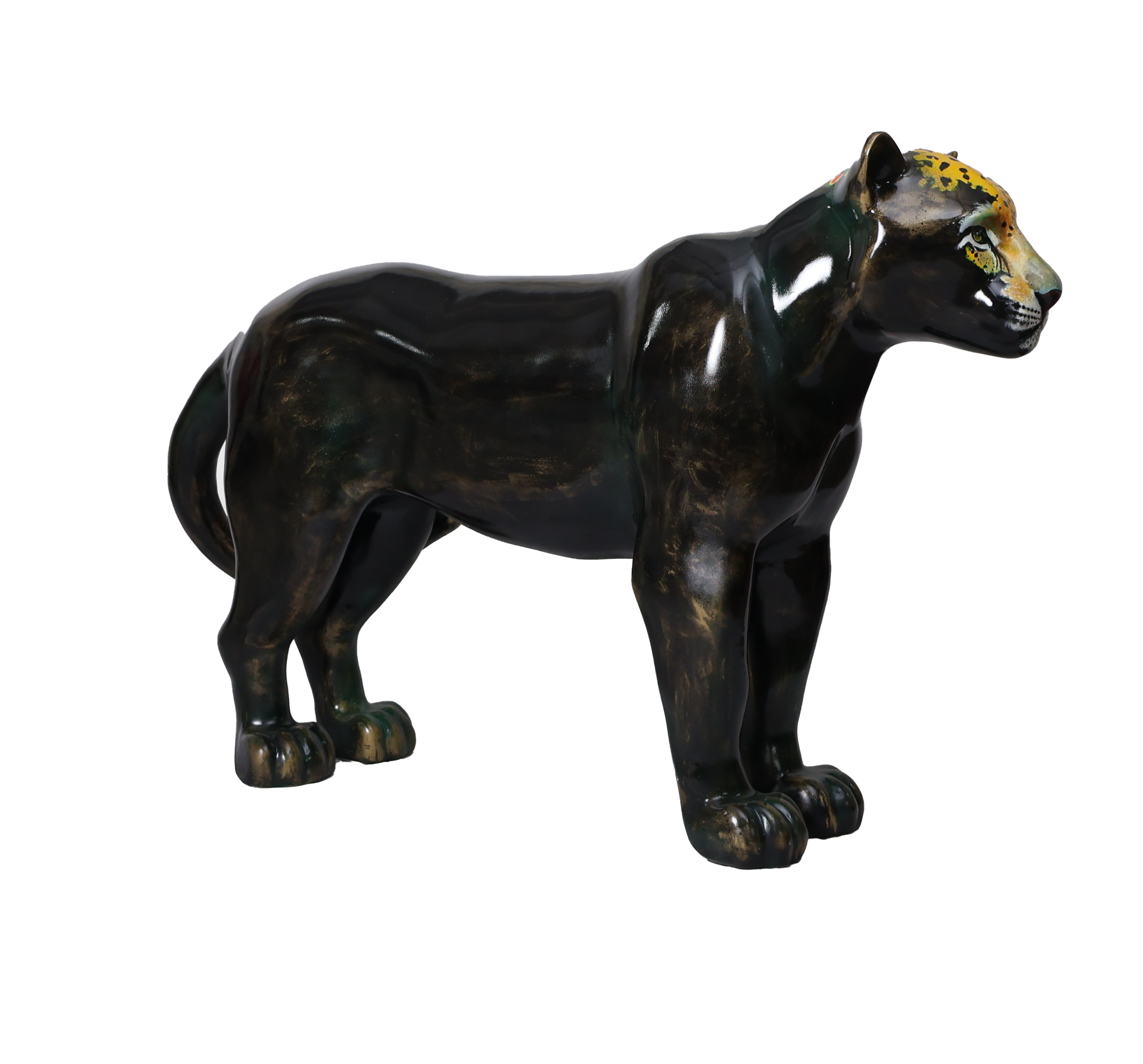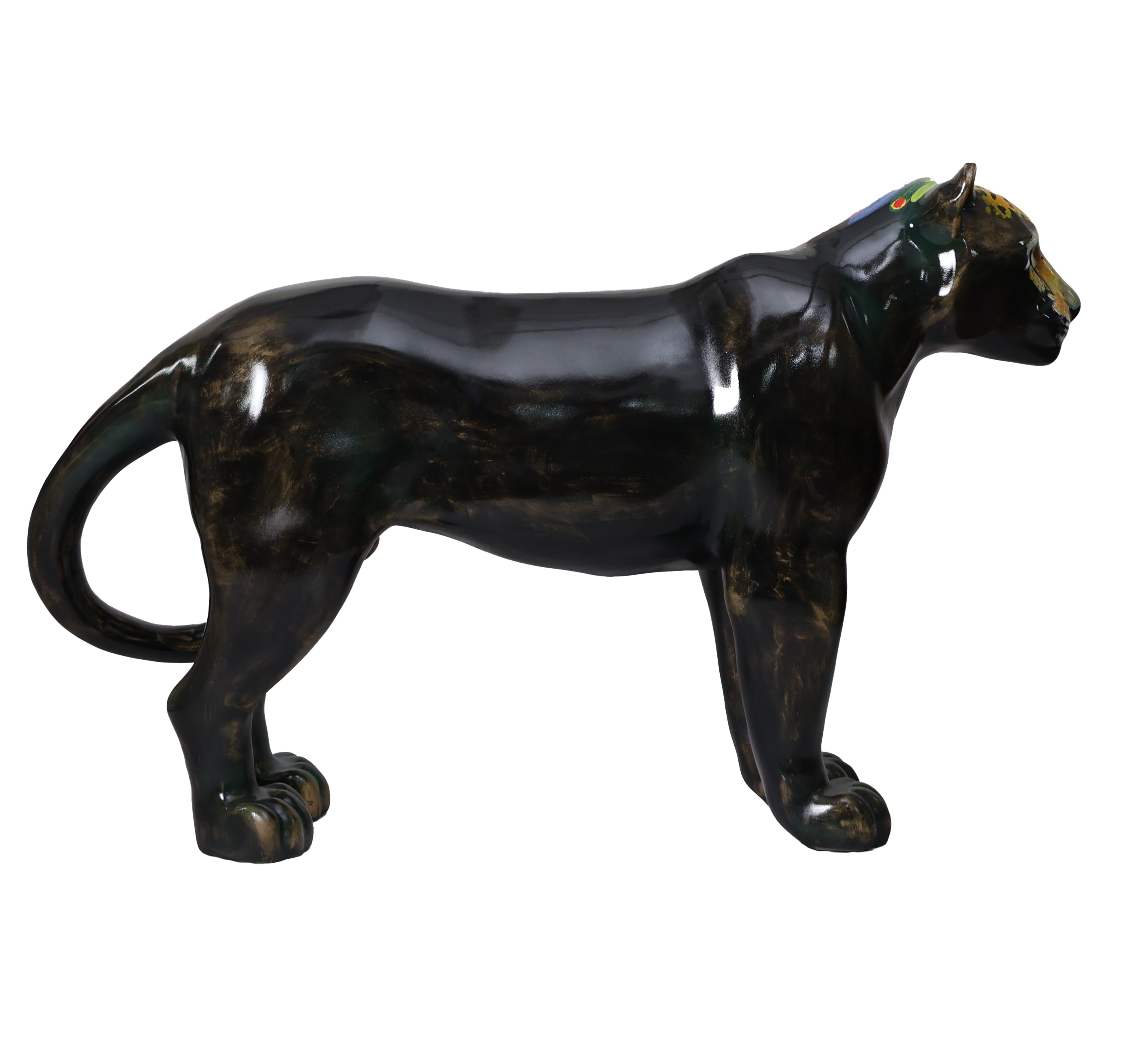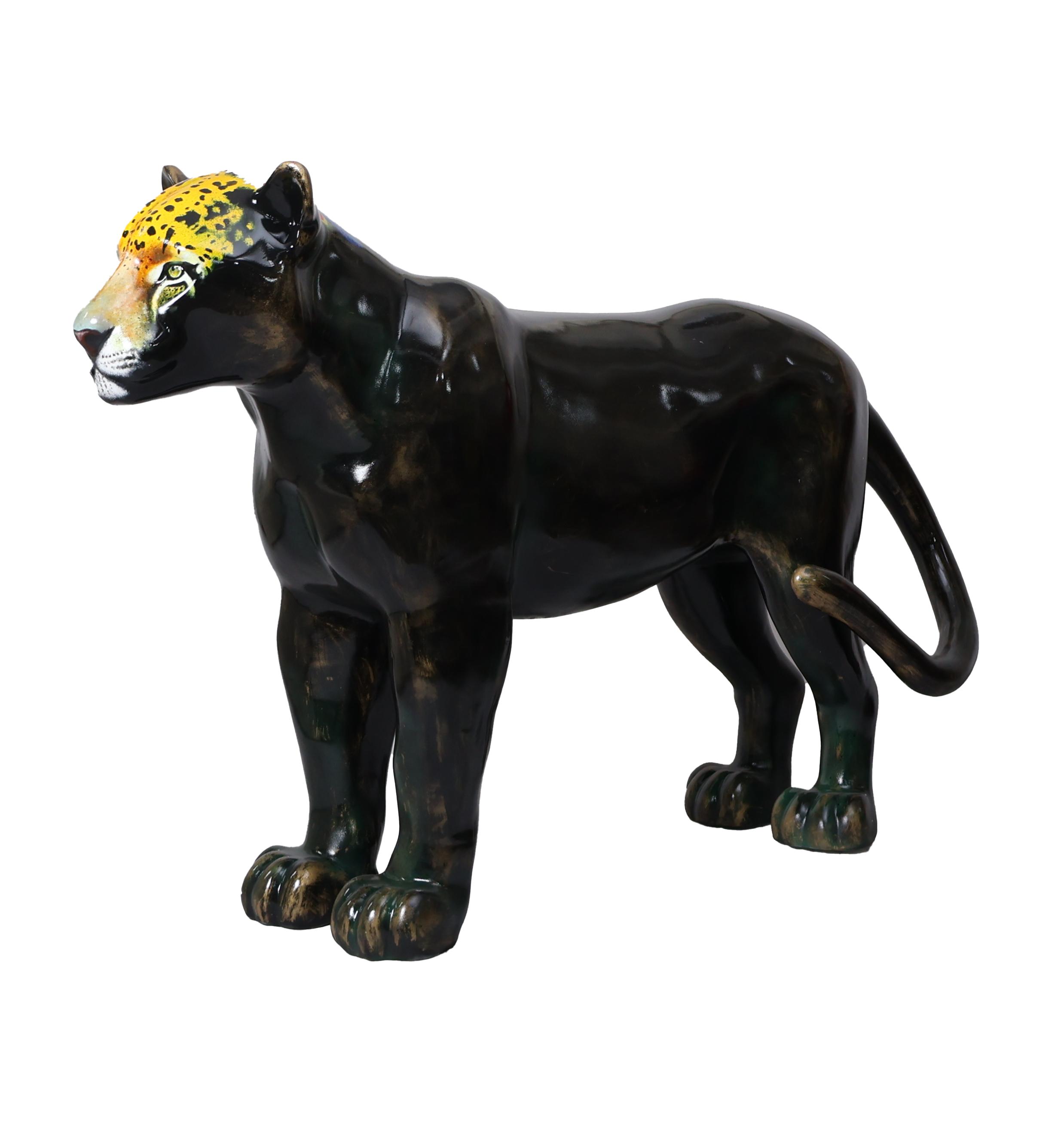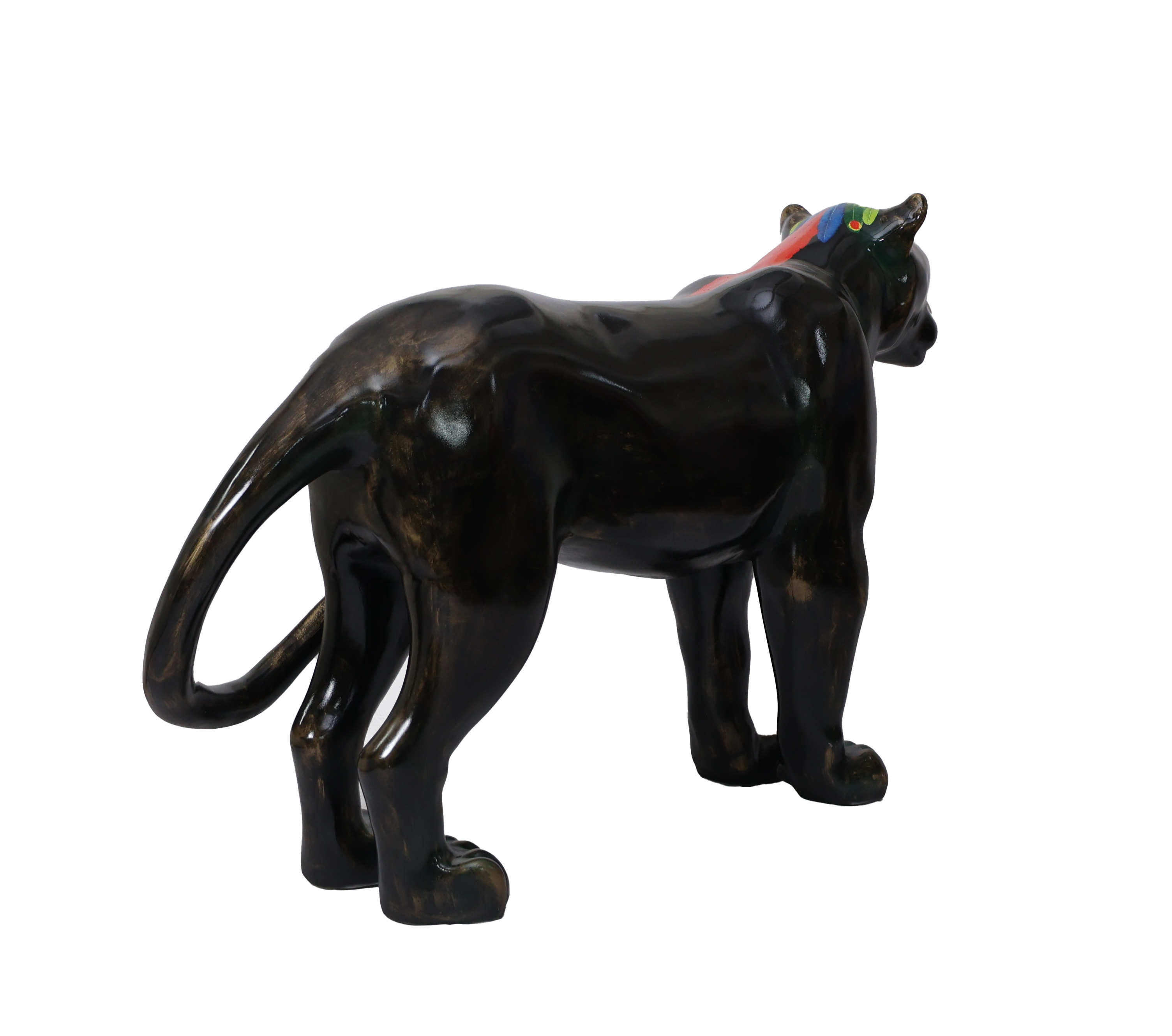 O corpo negro da onça, com manchas douradas e verdes, representam uma escultura feita de um metal nobre e resistente, já lembrando uma espécie desaparecida, que existe apenas na homenagem, em uma linda obra de arte. A onça pintada traz em seus lombos um cocar indígena, em referência aos povos originários, fazendo parte do seu mundo existencial, onde é sagrada, celebrada em rituais e conhecida como: ZAUARO HU.