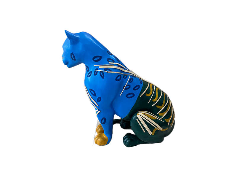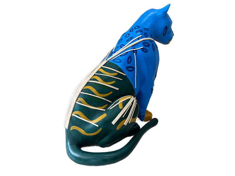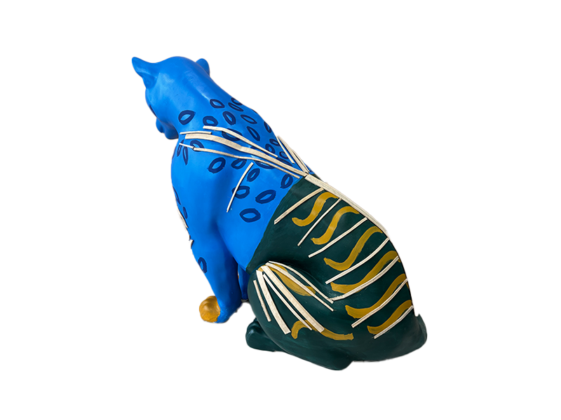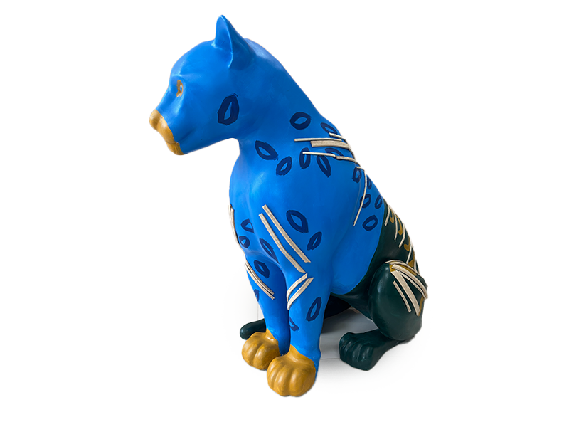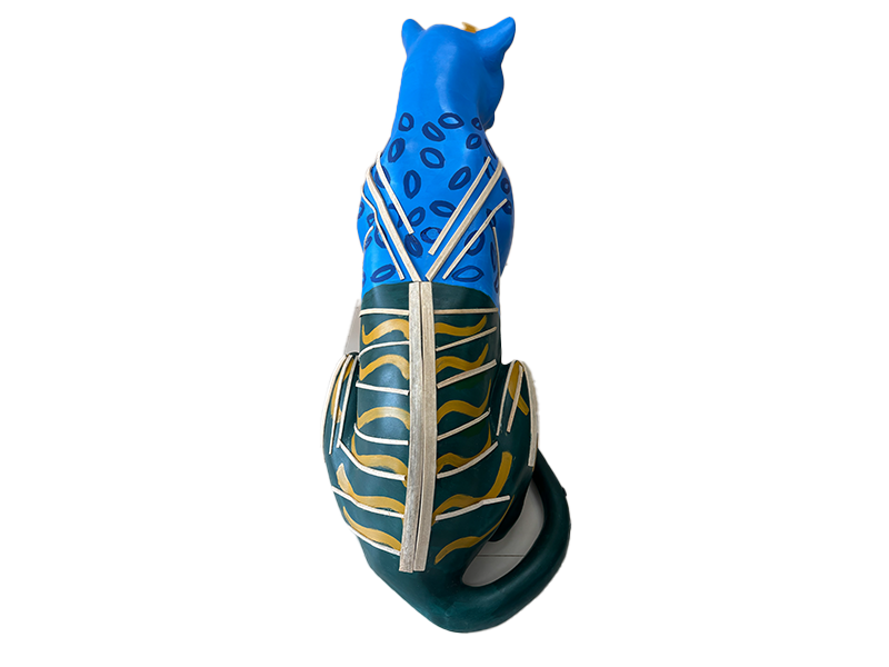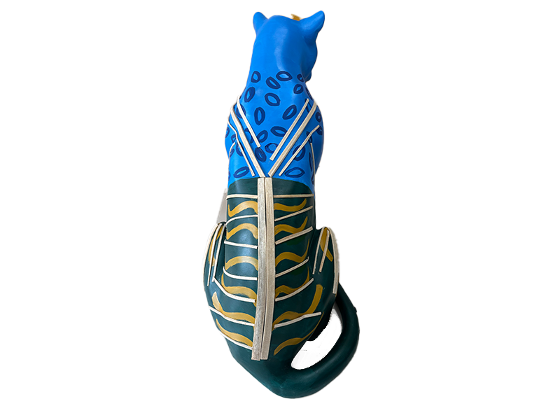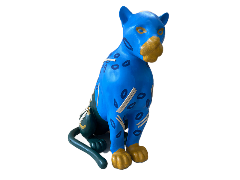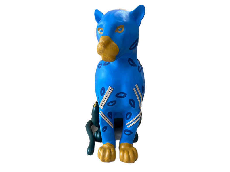 A onça jaguara azul nessa leitura de "redenção a onça dos três mundos " alerta sobre as urgências climáticas para com o histórico da territorialização visando integrar a manutenção e dignidade da vida e da preservação ambiental para os povos amazônicos originários da floresta, incluindo a onça espelhando o arquétipo da devoção da força e subversão para com a ordem alheia que gera a desordem de sua existência.